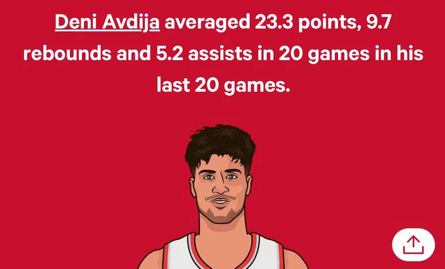开拓者自媒体shaesharpeshow晒出一组阿夫迪亚的数据,与球迷分享。 上赛季最后20场比赛,阿夫迪亚场均23.3分9.7篮板5.2助攻。 “如果他一个赛季都保持这个数据,他将成为开拓者的全明星球员。”shaesharpeshow附文道。