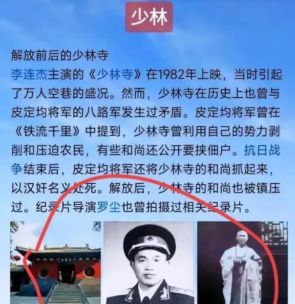 原来释永信不是第一个把少林寺“玩坏”的,早在1944年就有人开了这“恶劣先例”。 你以为少林寺一直是功夫圣地,高僧云集?其实不然,早有和尚背叛民族,勾结日军当带路党。1944年那会儿,八路军将领皮定均差点栽在寺里。皮定均这人,出生在安徽金寨一个穷苦人家,1914年那年,家里穷得叮当响,他小时候就得放牛讨饭,日子过得苦哈哈的。十三岁就加入农民协会,接触革命想法,1928年进共青团,次年参加红军,1930年转党,从排长干起,一步步打拼。鄂豫皖苏区反围剿,川陕根据地反围攻,他都冲在前头,指挥部队打得日伪军找不着北。长征时候,他当连指导员,带队翻雪山过草地,队伍在风雪里艰难前进,好些战友掉队,他组织大家互相扶持,坚持到陕北。抗日战争爆发,皮定均进八路军一二九师,先当随营学校营长,后升特务团团长,在太行山区搞游击战,指挥部队伏击日军补给线,缴获不少东西。1944年,他率豫西抗日独立支队挺进豫西,开辟根据地,部队穿越河流山地,连续作战,建立红色政权。解放战争里,他参加淮海战役、渡江作战,指挥部队攻城略地,立下大功。新中国成立后,转空军副司令员,负责建设和训练,1955年授中将军衔,继续干军事工作,一辈子奉献给军队。 说到1944年少林寺那档子事儿,得从背景说起。那时候,日军占领河南大片地方,少林寺里有些僧人见风使舵,投靠日本人,当起汉奸带路党。他们提供情报地图,还把寺里武功秘籍教给侵略者,换取赏钱和保护。皮定均带队路过登封,听说寺里情况复杂,就化装成游客去探底细。结果,寺里知客僧假意招待,带他们进客堂喝茶,锁上门,外面一堆武装僧侣围上来,想在死胡同里灭口。皮定均发现不对劲,质问对方是不是已卖国求荣,那些僧人慌了神,跪地求饶,说是受日军逼迫。皮定均警告说附近有八路军大部队,若敢动手就全歼他们。僧人们一听,武器都放下了,不敢阻拦,让他一行人撤走。这事儿暴露了少林寺内部问题,本该守护民族的和尚,却为私利背叛,开了恶劣先例。相比之下,当代释永信被指过度商业化,寺里门票收入成堆,挪用资金、违反戒律,问题一堆堆冒出来。可见,少林寺从古到今,都不是净土,总有败类混迹其中,逐利忘本。 事件过后,皮定均没耽搁,继续加强豫西抗日工作。他率部攻克日军据点,像夜袭巩县黑石关,部队潜行上坡,炸毁关口,俘虏敌人。根据地越扩越大,建立地方武装,训练民兵,多次伏击日伪军补给队,缴获物资支援前线。少林寺勾结行为曝光,抗日力量进去整顿,有些僧人醒悟,加入八路军队伍,建立党小组,释永贵还当上副区长,带头抗日。皮定均指挥作战,参与解放战争多项战役,淮海战场上调整部署,确保胜利。新中国成立,他转空军领导,组织飞行训练,参与军事演习。1976年7月7日,他坐飞机去演习地,遇上恶劣天气,飞机撞山坠毁,皮定均遇难,年仅62岁。少林寺后来经历变革,当代时期商业化争议不断,释永信管理下,寺里成立公司,门票和项目收入成主打,但挪用资产、违反戒律的丑闻爆出,坐实了传闻。