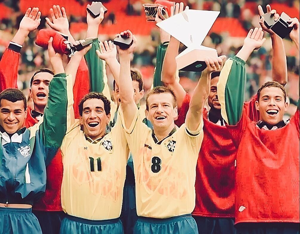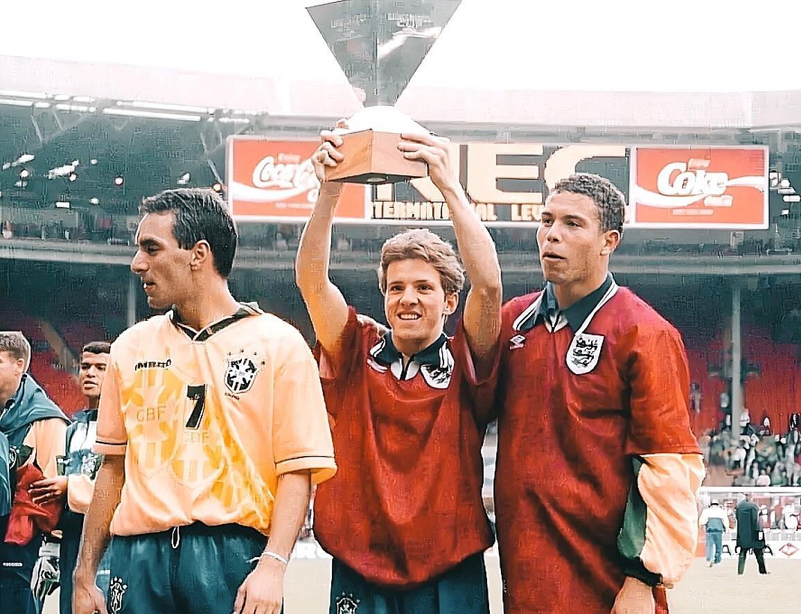 1995年,温布利大球场的这项赛事还有人记得么? 为了预热1996年欧锦赛,温布利大球场举办的“茵宝杯”足球邀请赛,这是第一届赛事,也是唯一的一届。 当年共有巴西、英格兰、瑞典、日本四支队伍参加了本次比赛,最终巴西队获得了冠军。 最经典的比赛无疑就是 巴西 vs 英格兰,当年的桑巴军团阵容里,年轻的罗纳尔多备受瞩目,他和野兽埃德蒙多组成了巴西队的锋线搭档,而两人在这场比赛里也都各进一球,再加上大儒尼尼奥精彩的任意球破门,巴西3:1战胜英格兰,登上冠军宝座。 十九岁的罗纳尔多,打进了他在巴西国家队的处子球,自此,一个专属罗纳尔多的“外星人”时代正式拉开了帷幕。