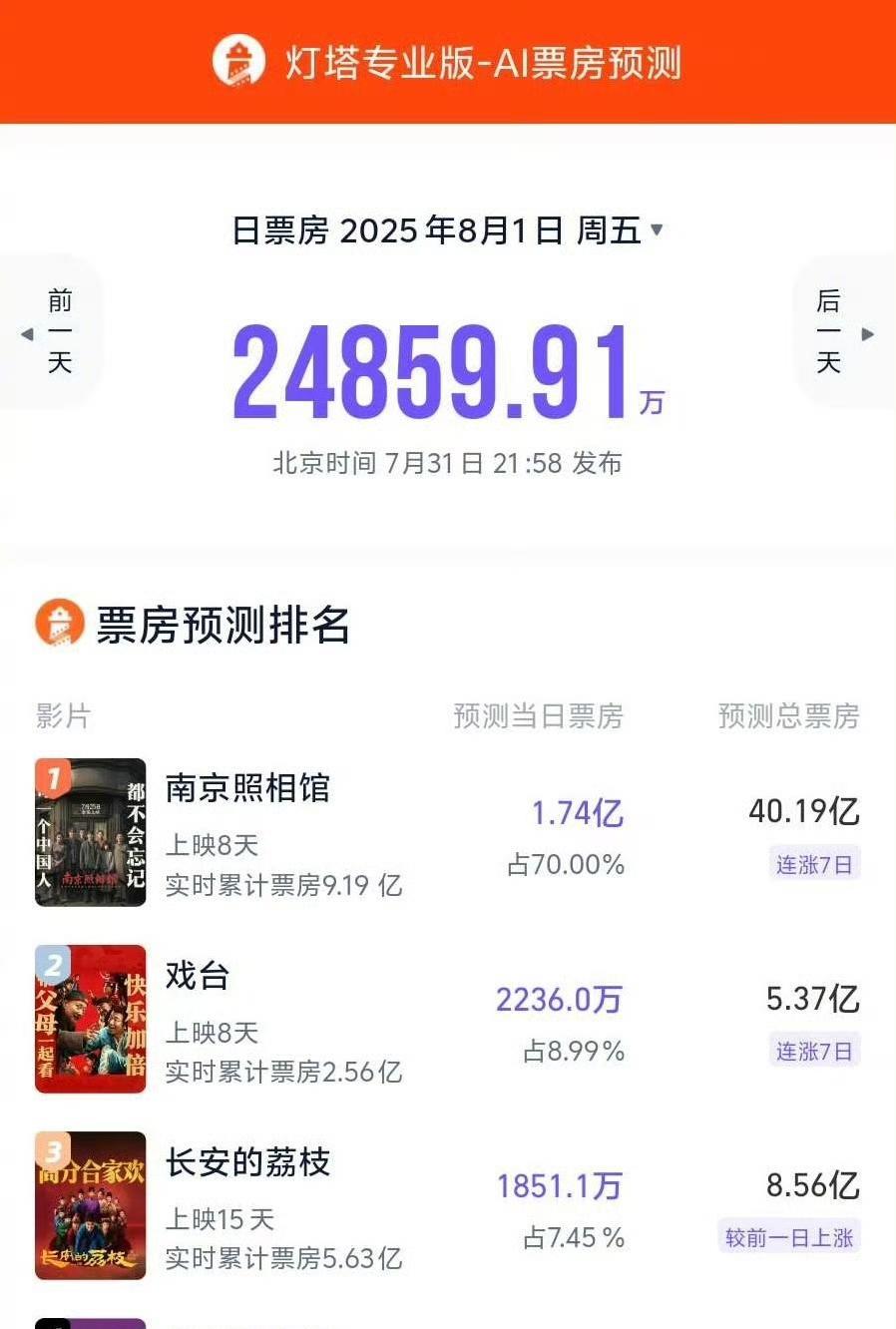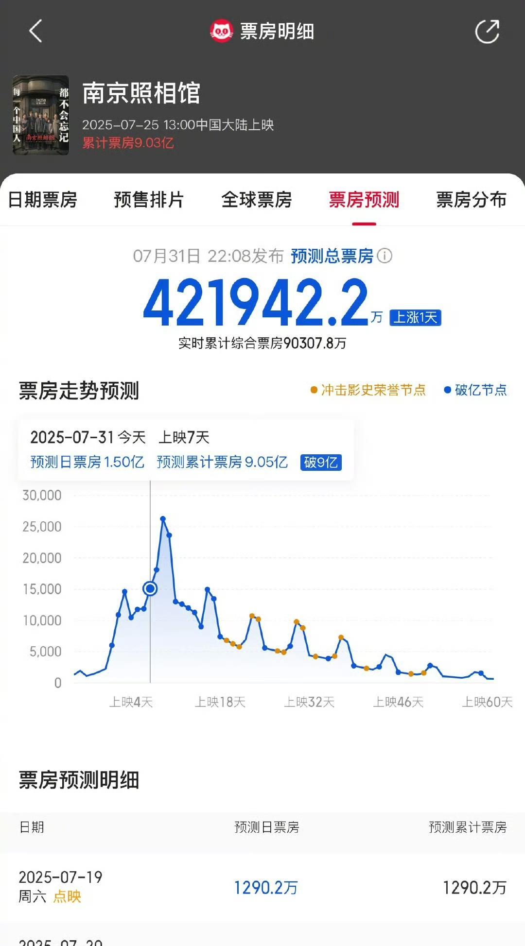 刘昊然、王传君、高叶、王骁主演的电影 《南京照相馆》今日票房破9亿,成为7月票房冠军。 猫眼、灯塔的预测该电影票房分别为42.19亿、40.55亿,你去看了吗?