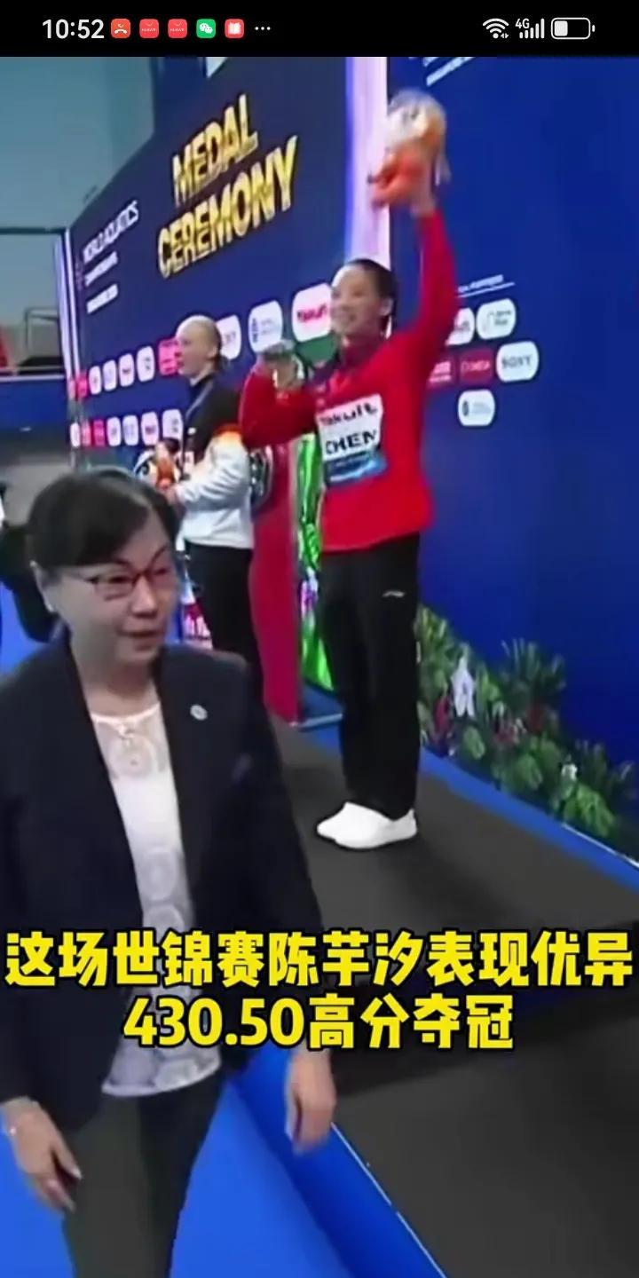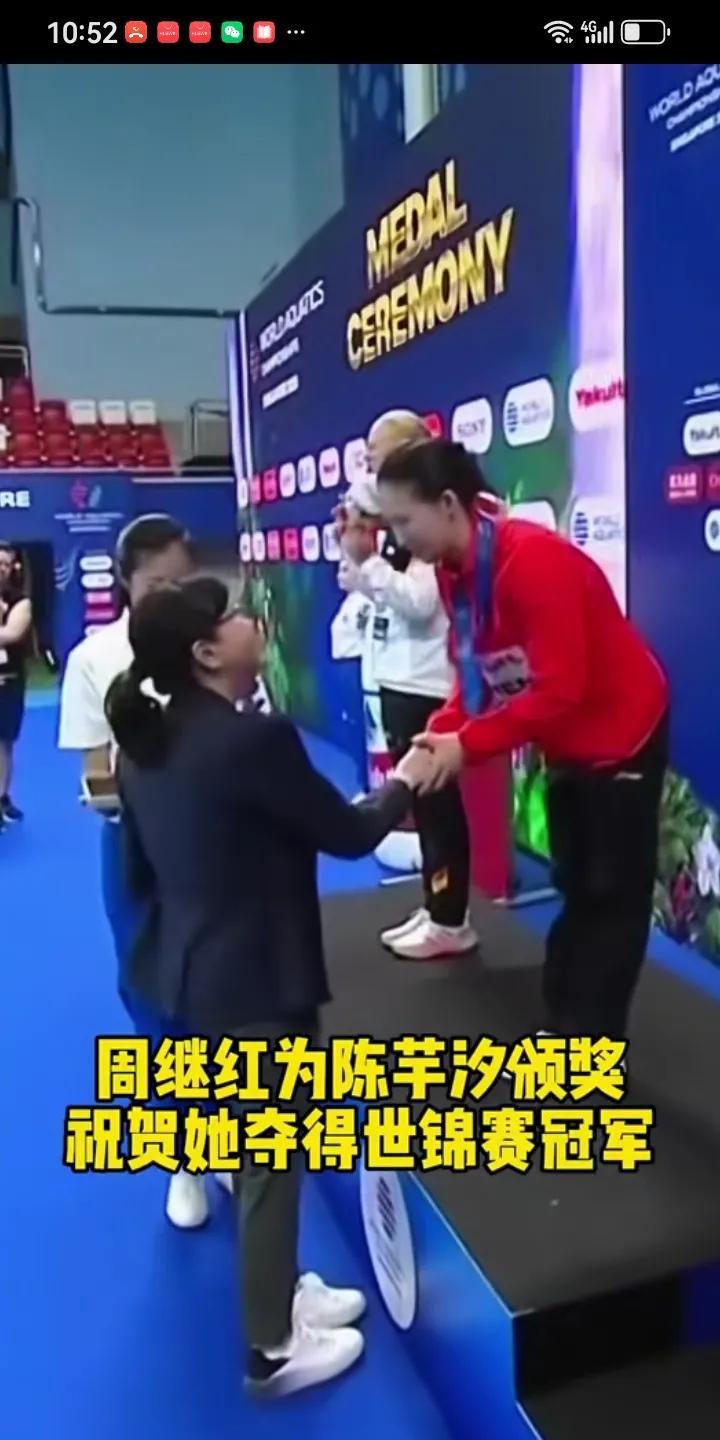 国际泳联副主席,中国跳水队总教练,周继红为新加坡世锦赛,跳水十米女单获奖者颁奖。