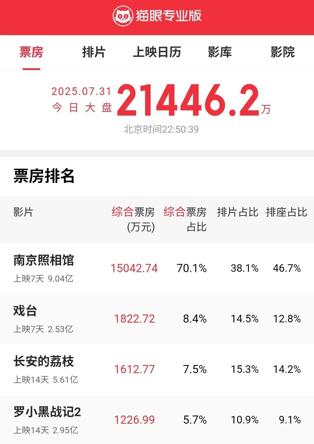 《南京照相馆》上映7天,票房已突破9亿元,排名占比已接近40%,票房占比更是达到了70%。