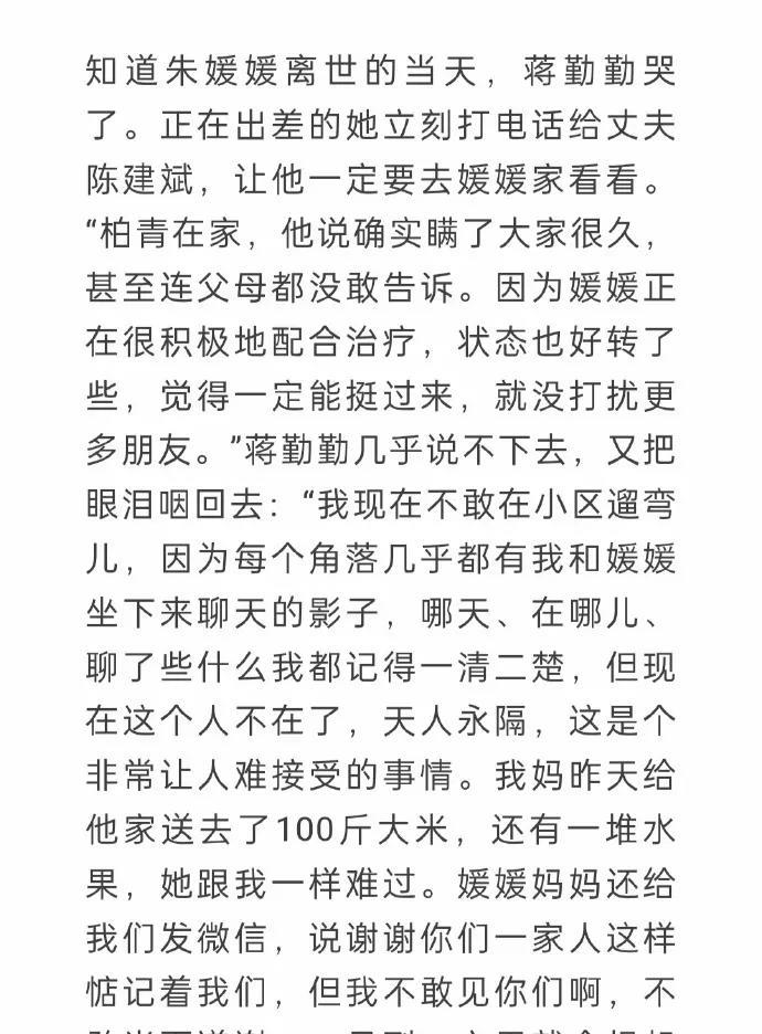 朱媛媛离世快80天了,她的去世让不少人悲痛。李乃文、唐旭已恢复工作,可她丈夫辛柏青还没走出丧妻之痛,停掉工作不再露面。 蒋勤勤在专访中聊到朱媛媛时哽咽流泪。她们是邻居,家庭情况相似,相处融洽,孩子还在同一学校。蒋勤勤回忆和朱媛媛最后一次通话,当时朱媛媛咳嗽厉害,却没说自己患癌。 如今蒋勤勤曝光朱媛媛家情况,她父母仍和辛柏青住,因太思念女儿都不愿见人。唉,失去至亲的痛,真不是一时能缓过来的。