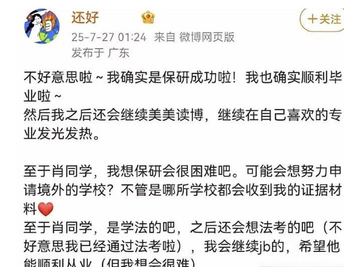 “杀人诛心!”武大图书馆性骚扰事件,上一秒法院判决男生无罪,下一秒女主就发帖炫耀自己保研成功!还冷嘲热讽地说男生没有保研资格!她毁了一个男生的一辈子,却还沾沾自喜,可惜我们一贯的思维,就是谁闹谁有理! 还记得2023年那起武大性骚扰事件吗? 如今2025年7月,法院一纸无罪判决,本该是男生肖某迟到两年的清白书,却成了一纸戳破现实残酷的证明。 经过漫长煎熬,性骚扰的指控终于被彻底推翻。 这一切的起因,源自2023年夏天武汉大学图书馆里的一场误会。 那天,肖某在图书馆自习,正因为特应性皮炎发作,瘙痒得难以忍受。他忍不住隔着裤子抓了抓裆部,试图缓解一些不适。然而,这个看似再普通不过的举动,却被坐在对面桌的杨某媛看在眼里。 杨某媛当时并没有直接与肖某沟通,也没有当面指责,而是默默地掏出手机,悄悄地录下了这段视频。 几分钟后,肖某并没有意识到自己已被偷拍,继续沉浸在自己解痒的动作中。杨某媛从她的角度看,这一行为显得尤为敏感,她断定肖某是在进行性骚扰,甚至将其称为“自慰”。 这种误解却没有任何沟通解决的机会。 事后,杨某媛并没有寻求图书馆工作人员的帮助,也没有向肖某提出任何质疑。 她直接将视频上传到社交媒体,发表了对肖某的指控,并要求他写下道歉信。 肖某当时并未理解事情的严重性,他拿出了自己的病历和药物购买记录,试图解释自己并无不当行为,只是因皮肤病发作而产生了不适。 杨某媛并不理会这些证据,依旧坚持自己的看法。 不久后,杨某媛将视频和道歉信一同发布到网络上,立刻引起了广泛关注。因为视频剪辑过度,掐头去尾的内容更让人产生了误解,肖某被迅速推向了舆论的风口浪尖。网络暴力随之而来,肖某不仅遭到恶意攻击,甚至连家人也未能幸免。他的照片被恶意PS成了“遗像”,个人信息被疯狂扒出,家人被人造谣中伤,甚至连年迈的爷爷都在承受不住巨大的压力下去世。 肖某被迫辞去了学校的课程,进入了医院治疗,他被诊断为重度创伤后应激障碍(PTSD)。父母本打算退休安享晚年,但为了支撑巨额医疗费用,他们不得不延迟退休,四处打工。由于肖某的状况,他们家的经济状况也因此变得越来越困难,背上了沉重的债务。 最让肖某心寒的,还是在事件尚未明朗,法院还未作出判决时,武大就先行决定给他记过,并取消了他原本可以获得的保研资格。 这一决定让他彻底丧失了继续深造的机会,也让他更加感到自己像是被整个社会遗弃。 两年后,法院的判决终于来了,肖某无罪。 令人意外的是,尽管杨某媛的行为导致了肖某的生活被彻底摧毁,最终的判决结果却没有对她造成任何实质性的影响。 她依然顺利地通过了法学院的保研,并且通过了法考,继续朝着自己的人生目标前进。 甚至,她还收到了香港浸会大学的博士录取通知书,似乎一切如她所愿,学业和未来都一片光明。 令人愤慨的是,杨某媛对这段过往没有丝毫愧疚之心。 她在社交平台上频频高调展示自己的学术成就,尽管从法律和道德层面来看,她并没有为自己曾经犯下的错误负责。 对于判决结果和自己恶意诬告的行为,她从未提起过一句道歉或反思的话语。 相反,杨某媛似乎对自己曾经做过的事情并不感到后悔,甚至有些得意。 她在社交媒体上发表的言论时常带有阴阳怪气的语气,暗示肖某当初遭遇的事情不过是“他自己的问题”,而她依然能在生活和学业上取得如此“出色”的成绩,似乎在无形中再次“嘲笑”肖某的遭遇。 她的这种做法让人不禁感到寒心,肖某和他的家人依然在经历着创伤和经济困境,而杨某媛却似乎完全没有意识到自己所造成的深远影响。 她的“成功”背后,是他人的痛苦与失落,却没有一点反思或忏悔。 她的行为不仅令人失望,更让人对社会的公正和对受害者的保护产生了质疑。 肖某的清白,法律已经给予,但他被毁掉的人生,还需要社会更彻底的“照亮”与弥补。 信源:凤凰网