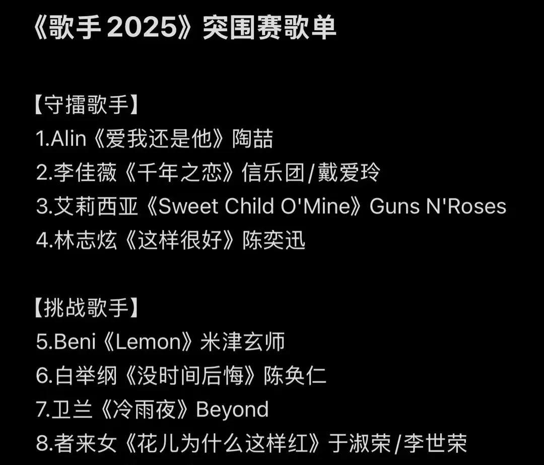 《歌手2025》官宣了明天第12期突围赛返场歌手的名单,包括格瑞丝、者来女、白举