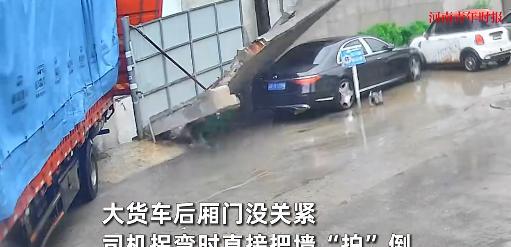“这下天塌了!”2025年7月,江苏,一大货车后箱门没关,司机拐弯时,门直接把墙