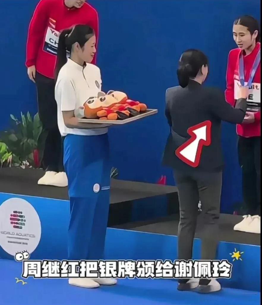 陈芋汐太难了,比赛投入全力夺冠,本想轻松拿个金牌,还得在颁奖仪式帮着“糊涂”的周继红主任打圆场!新加坡游泳世锦赛女子10米台颁奖仪式,周继红担任颁奖嘉宾,给季军谢佩铃颁奖时,可能实在不习惯给中国选手颁铜牌,竟然直接拿起银牌就给谢佩铃戴上了,一旁的陈芋汐见状赶紧提醒周继红,周继红本想再摘下来,又觉得不好,只能将错就错,接着给亚军德国选手发了铜牌,但悄声说明了一下,之后还是陈芋汐在合影时和德国选手沟通后,把两人的奖牌换了回来,三人开心合影。