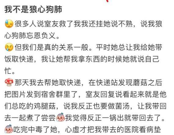 “学校就没责任吗?”美女大学生见学校草丛里长了野蘑菇,看着没毒就采回宿舍煮着吃。不料,晚上就中毒住进医院,室友帮忙垫了医药费。结果美女还没出院,就将室友和辅导员,以及学校挂到网上,要求他们承担自己的医药费和营养费。 几个月前,在某社交平台,看到了这样一个炸裂的“维权”贴。 发帖人是一个学校的女大学生,因为前一天晚上和室友一起去取快递的时候,在学校的草丛中发现了几株野蘑菇,因为颜色不鲜艳,女子就认为它们没有毒。室友就半开玩笑的说,不行你就捡回去尝尝。 可没想到女子当了真,直接将蘑菇采了回去,回宿舍之后迫不及待的几干净煮了汤。当时女子煮好之后还想和室友分享,不过室友都不敢喝拒绝了。没想到当天晚上女子就感觉肚子特别疼,上吐下泻的。室友害怕女子出事,就赶紧将女子送到了医院检查,一查果然是食物中毒。 因为当时的女子状态很差,室友还帮忙垫付了医药费。等到第二天,辅导员早课点名的时候,才发现女子缺勤了,然后就联系女子,女子这才说了她乱吃东西中毒了。而后女子就问辅导员,这种事情怎么跟学校索赔。 辅导员直接懵了,女子自己采东西乱吃,又不是学校种植的毒蘑菇,学校为什么要承担责任?接着女子就说出了非常经典的话:“抛开事实不谈,难道学校一点责任都没有吗?” 女子说她每个月只有1500元的生活费,现在住院已经花了367元,虽然室友垫付了医药费,但是这是室友应该的,因为是室友让自己采蘑菇的。剩余的医药费自己没有钱交,如果跟父母要钱的话,父母也是不会管的。 更主要的是,女子觉得自己中毒是吃了学校的毒蘑菇,这就跟学校出现毒蛇一样,在学校中毒,学校就是需要负责任的。女子还说如果学校不愿意赔偿自己的损失的话,那么她只能将这件事情挂到网上去。 女子将事情发到网上之后,很多网友都是一头雾水,现在碰瓷还能这么理直气壮的吗?虽然很多人抨击女子无耻,但是在她的心里学校、辅导员、室友、乃至快递站都是有责任的。 后来辅导员和女子发消息说,考虑女子家庭情况特殊,和几个老师给女子筹了500元的医药费,并警告女子不要在宿舍使用大功率电器了。 学校的宿舍手册中明令禁止学生在宿舍使用大功率电器,更不能自己煮东西吃,女子本身的行为就存在多个违规的问题。大学生也是一个成年人,一个成年人对自己的行为本来就要负责,辅导员之所以松口,也是懒得和孩子计较,但是出了社会就不会有人在这么惯着她了。 对此,你怎么看呢?欢迎在下方评论~