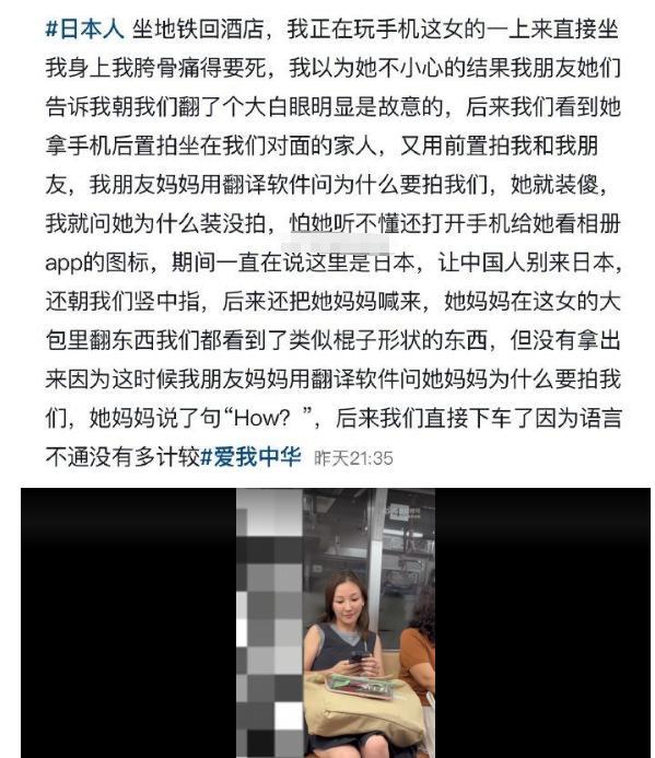 7月29日,中国女游客带着家人去日本旅游,当天她们结束游玩行程,准备乘坐地铁回酒店休息。她们一家人是面对面坐着的,当时都在低头玩手机。可是突然一个日本女子上了车之后,不分青红皂白,直接非常重的坐到了女游客的身上。 女游客当时以为日本女子不是故意的,揉着仿佛要碎掉的胯骨,看向了日本女子,没有想到女子直接翻了个大白眼。女子坐下来了之后,直接掏出手机,先拍了对面的女游客的妈妈,然后又对准女游客。女游客表示不要对她们录视频,还指了指手机的相册。 可是女子就是装作听不懂,一直贴脸录制,还用英语询问她们是不是中国人,得到肯定的回答之后,就一直再重复“这里是日本,中国人不要来日本。”女子用英语说着很多脏话,并竖起了不友好的手势。女游客被惹恼,也打开了摄像头,对着女子开始贴脸录视频。 可是女子根本不怕,仍旧骂着女游客,双方发生冲突之后,女子还叫来她的妈妈,并轻蔑的告诉母亲,她们都是中国人。母亲听完之后,也竖起了不友好手势,然后就从背包里寻找到一个类似折叠棍棒的东西。 地铁门关上的那一刻,日本女子在列车上以胜利者的姿态挑衅着。女游客实在气不过,就将这件事情发到了网上。原本以为很多人都会和女游客一边,斥责搞歧视的日本女子。可是万万没有想到,更多的人觉得女游客就是活该。 因为国家不仅一次强调,少去不友好中国的国家,但是却有些人专门喜欢“热脸贴冷屁股”,遇到不公平的待遇,就七个不服八个不愤的。 放眼全世界,没有任何一个国家比中国还要安全。我们是可以接纳各种各样的文化,也有权利去了解世界上任何一个国家。但是从某种程度上来说,一些不友好中国的国家,确实会增加遇到歧视和不公平的待遇,这在旅游之前要做好心理准备。 当然说这并不是不让出国旅游,而是希望中国游客在外出的时候,做好保护自己的措施。出了国门,任何一个中国人代表的都是中国形象,我们要尊重别人的社会秩序,但是遇到不公平的待遇,就是要说出来。 对此,你怎么看呢?欢迎在下方评论~