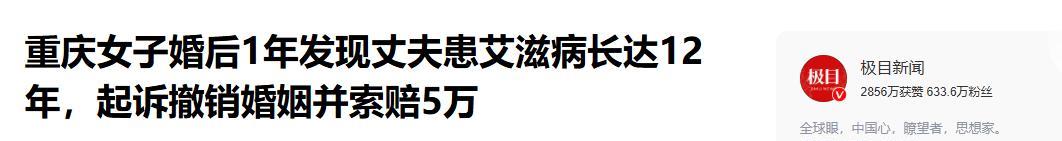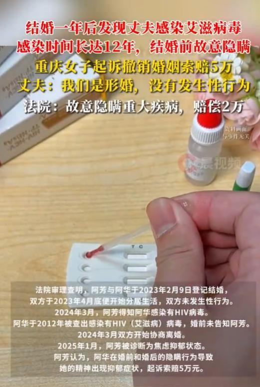 重庆女子和丈夫从恋爱到结婚,发现他都对夫妻生活非常排斥,甚至宁愿分居也不愿碰她。原本女子以为丈夫“不行”,却不料,婚后1年意外发现,丈夫隐瞒了12年的艾滋病史。女子觉得被欺骗,为此还患上抑郁症。最终她将丈夫告上法庭,索赔5万。 7月30日报道,重庆女子小美从来没有想过,她原本无比期待的婚姻,竟会因为丈夫,让她每天陷入无穷的恐惧之中。2023年2月,小美和阿虎相识相恋,两人很快就领了结婚证,可是结婚不过两个月,新婚夫妇就开始了分居生活。 原来,小美发现丈夫总是对自己为空避之不及,不管是在谈恋爱的时候,还是结婚之后,总不愿意碰自己。这样的婚姻也没有意思,小美索性直接蜂聚,各过各的。两人虽然有名义上的关系,但和陌生人没有任何区别。 直到2024年3月,小美终于找到答案,明白丈夫为什么始终不愿意碰自己了。 小美在阿虎的住所中发现了一张医院的诊疗单,上面显示阿虎感染了艾滋病,小美顿时就感觉到非常害怕,虽然分居,但是自己依旧和阿虎是最亲近的人。小美就找到阿虎对质,阿虎见隐瞒不住,索性坦白,说他从2012年就被确诊了艾滋病。 小美当时就懵了,自己的婚姻为什么突然变成了这样,阿虎明明知道自己有病,为什么隐瞒自己结婚?这让她如何再嫁人。小美对自己的前路充满迷茫,每天陷入无限的焦虑和恐慌中。 为此小美患上了抑郁症,小美知道自己不能坐以待毙。所以就将阿虎告上了法庭,要求撤销婚姻,并索赔5万元。 可是在法庭上,阿虎说,两人在结婚之前都说了他们属于名义上的结婚,并且阿虎也和小美做了婚前体检。不进行夫妻生活,是小美在结婚之前说不想要小孩子,所以就拒绝了夫妻生活,后来两人才分居了的。 至于小美没有得到阿虎的婚检结果,就是因为小美将“丁克”的思想告诉了婚检的工作人员,所以婚检机构才没有给小美下达体检通知。可是小美认为,不管自己要不要孩子,自己都是有知情权的,阿虎不应该隐瞒自己有重大疾病的事实。 最终,法院审理认为,双方属于可撤销婚姻的情况,故判决两人婚姻无效,并勒令阿虎赔偿小美2万元的精神损失。 事情传到网上之后,有网友觉得阿虎的不坦诚是一方面。但是婚检机构只检查,不告知也存在很大的问题。更重要的是,他们已经检查出来了艾滋病患者,不管家属知不知情,都应该尽责履行告知义务,不然也不会造成这么大的误会。 现在很多年轻人为了应付家里也好,或者有其他的喜好也罢,形式婚姻正在迅速增加。但是不管是何种婚姻,还是不能草率,一定要看清楚对方的性格,尤其是婚前真的非常必要。 对此,你怎么看呢?欢迎在下方评论~