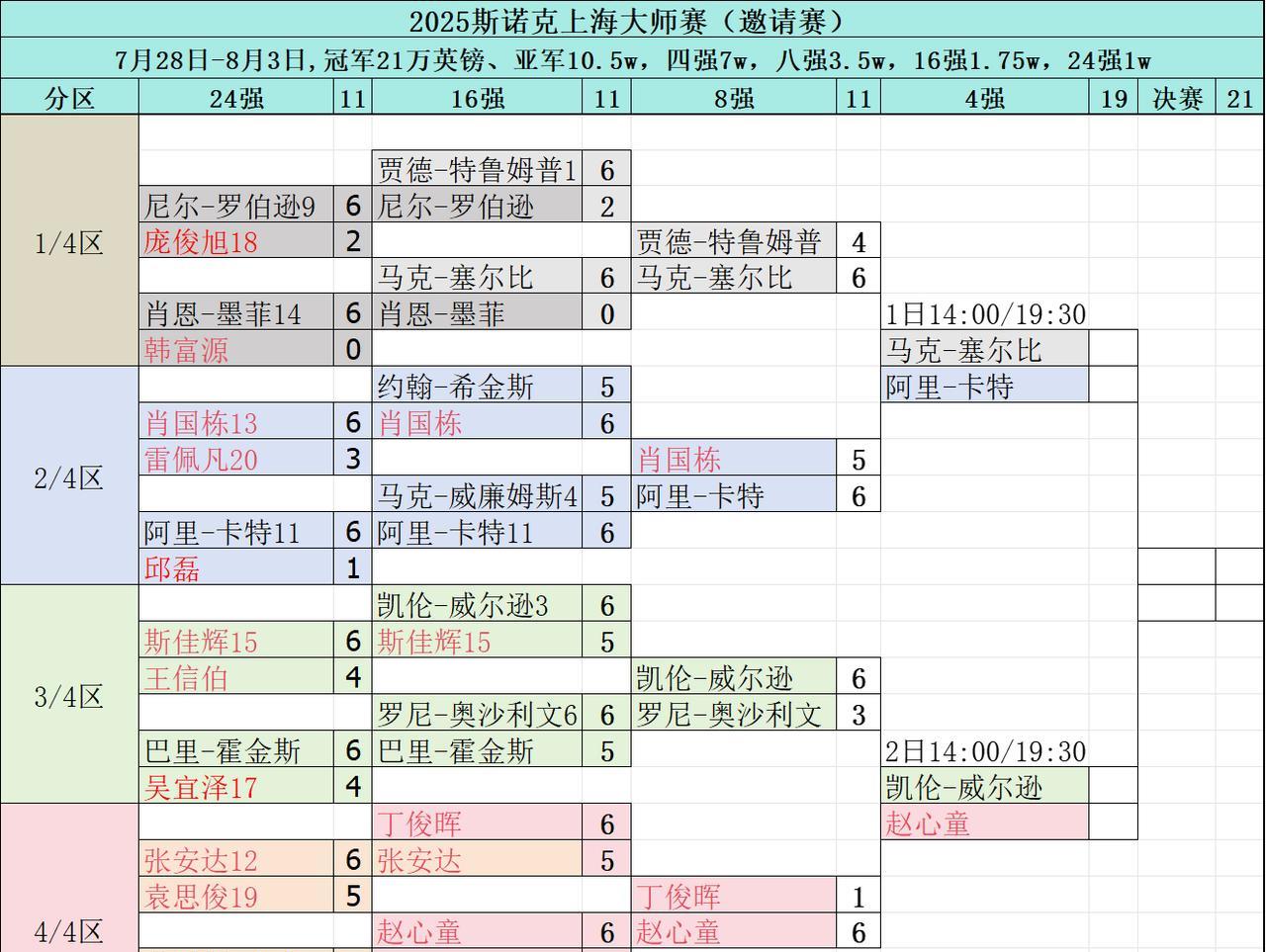 斯诺克赛场,今日赛程,2025年8月1日 #2025斯诺克上海大师赛# 今日进行首场半决赛的争夺,赛制为19局10胜制,上半场打满8局,下半场决出胜负。 第一阶段14:00和第二阶段19:30,阿里-卡特vs马克-塞尔比。 进入决赛的奖金10.5万英镑,失利者收获四强奖金7万英镑。 中国选手赵心童与凯伦-威尔逊的比赛在明天同时段进行。 具体赛果和赛程,见附图表。 #赵心童# #上海大师赛#