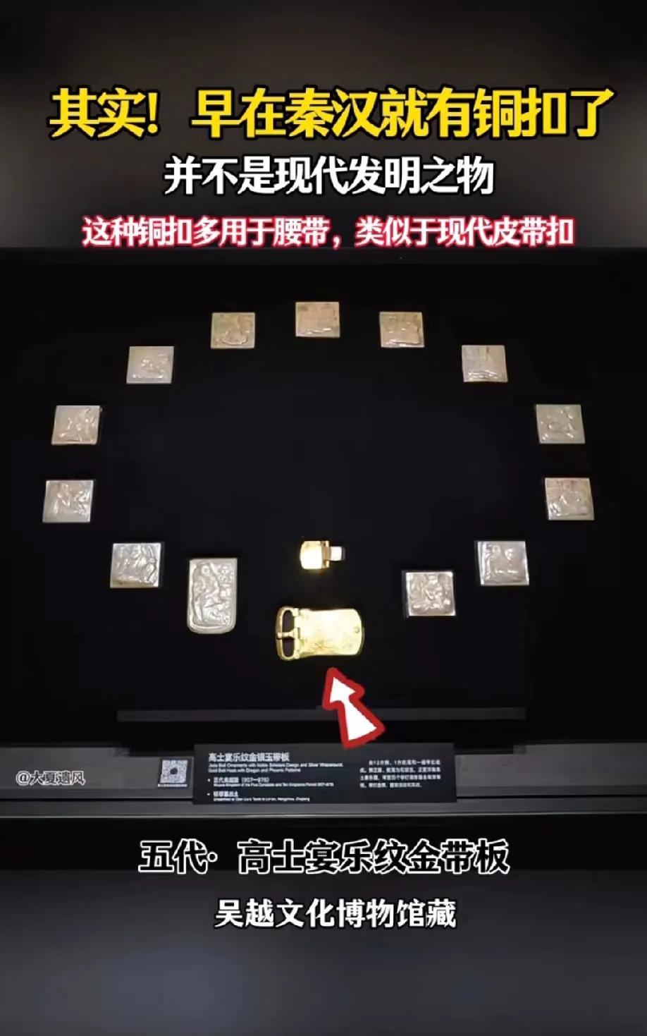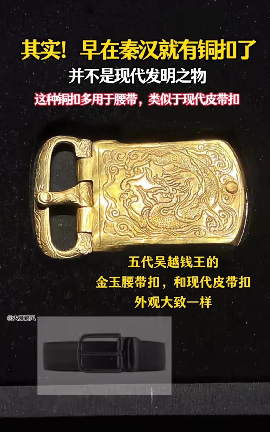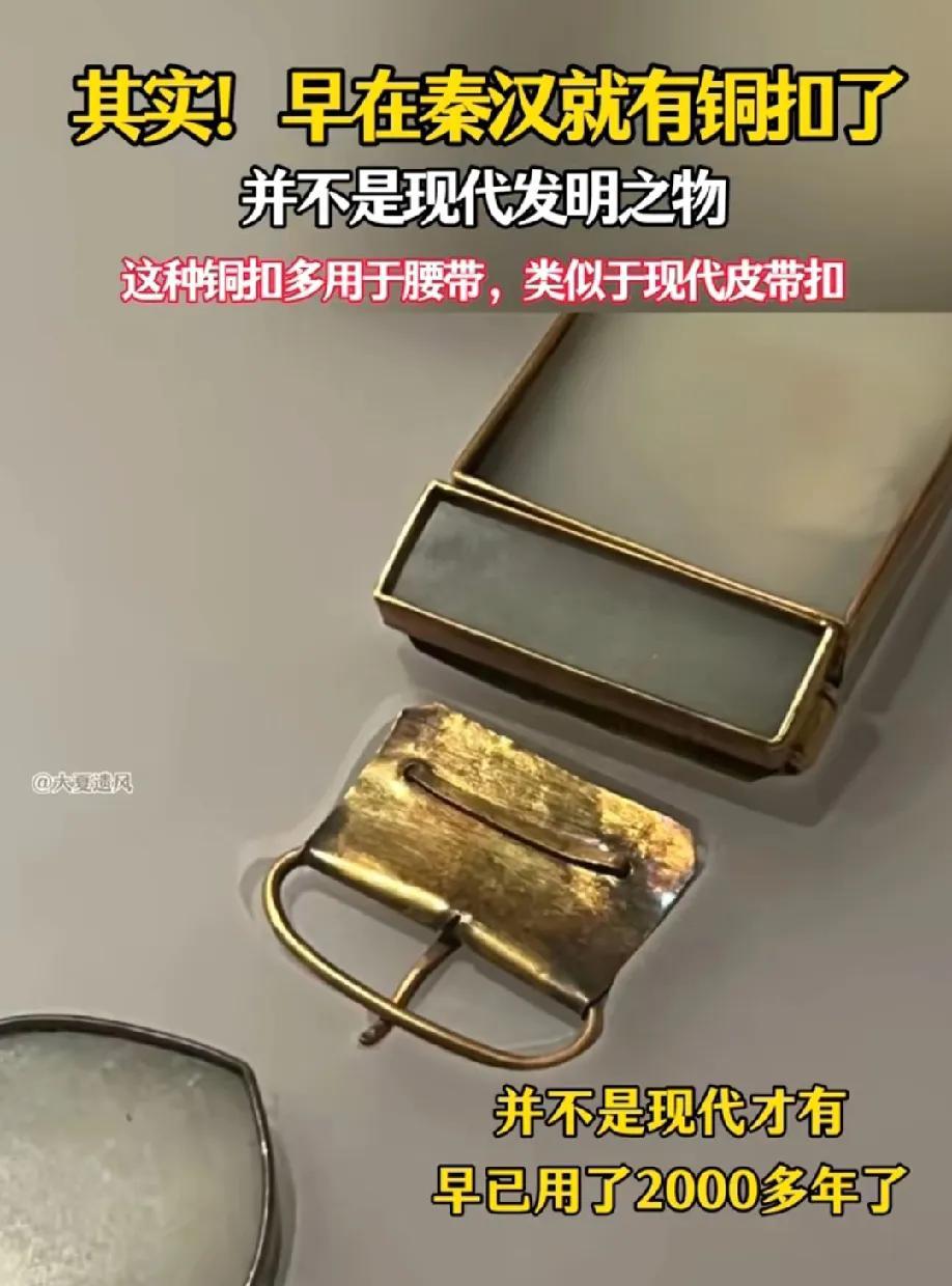 其实早在秦汉就有“铜扣”了,并不是西方工业之物!刷到这些古代物件,真得感叹一句:老祖宗的智慧,咱还是后知后觉了! 你看那铜扣,秦朝士兵行军水壶、套马缰绳用的都是活扣;还有玉腰带扣、金玉腰带扣,精致得比现代物件还耐看。以前总以为是西方人搞出来的东西,甚至某名牌包的纹饰,原来都是古人玩剩下的。 有人说“一切发明,只是发现大明”,这话虽带点调侃,却也没毛病——《永乐大典》里藏着多少百科知识?说不定欧洲文艺复兴都从这儿偷师了呢。古人的智商可不比现代人差,只是很多东西藏在历史里,让我们产生了认知断层。 难怪有人觉得,满清让华夏文明倒推了五百年。要是这些老手艺、老智慧能一直传下来,说不定现在还有更多惊喜。 你还见过哪些“古人早就玩过”的厉害物件?