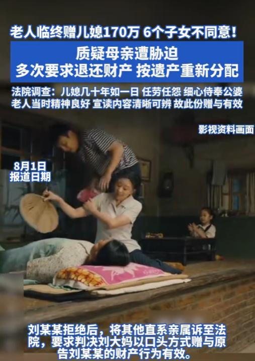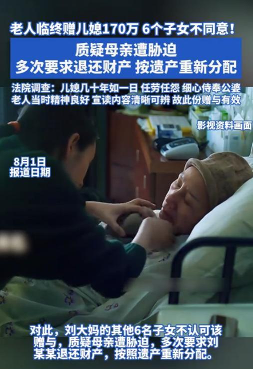 “活该她拿钱!”吉林,一老人在临终前将170万元财产赠送给儿媳,遭到了6个子女的反对,他们怀疑母亲被威胁,要求儿媳退还财产,并按照遗产重新分配,然而,法院判了,网友:给这个婆婆点赞! 这个老人跟老伴儿一辈子生了七个孩子,按说儿女绕膝是福气,可真到了需要人照顾的时候,陪在身边的却是小儿媳,自打这小儿媳嫁过来,就没跟老两口分开过,每天三顿饭端到跟前不说。 到天冷了掖被角,头疼脑热了端水喂药,家里大事小情都是她操心,老两口身体不算硬朗,特别是后来几年,下床都费劲,全靠这儿媳里外忙活,直到两位老人都走了,正好老房子赶上拆迁,补了170多万。 老人心里明镜似的,知道这些年谁真心待自己,临终前,她拉着儿媳的手,说这钱就给她了,还特意录了段视频,说得明明白白:“这钱是给我儿媳妇的,她照顾我们老两口几十年,不容易,我乐意给。” 哪想到老人刚走,其他六个儿女就找上门了,“妈肯定是糊涂了”“说不定是你逼她的”,七嘴八舌地让儿媳把钱交出来,说该按遗产平分,儿媳当然不乐意,自己几十年的付出,老人看得清楚。 这钱拿得问心无愧,于是干脆告到了法院,法院调了不少证据,邻居们都作证,说这儿媳对老人是真上心,大冬天半夜送医院都是常事,再看那段视频,老人说话清楚,眼神也亮,精神头足着。 一点不像被胁迫的样子,最后法官判了:老人的赠与有效,这 170 万就该归儿媳,不得不说,这婆婆分得清好坏,做得对,养儿女防老,可真到事儿上,未必有个贴心的儿媳顶用。 说到底,人心换人心,谁真心付出,谁就该得这份回报。 信息来源:《老人临终赠儿媳170万 6个子女不同意!质疑母亲遭胁迫多次要求退还财产按遗产重新分配》津云