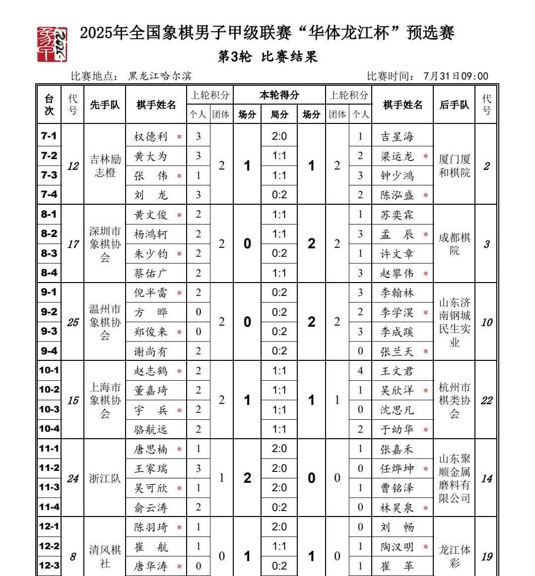 北京队三战全胜,王禹博取得关键胜利。 2025年全国象棋男子甲级联赛“华体龙江杯”预选赛,今天上午第三轮,北京队凭借王禹博的胜利战胜上海金外滩队。深圳群众体育促进中心战胜广东象棋协会、杭州环境集团战胜河南全民健身中心、香港象棋总会战胜浙江民泰银行、河北与江苏海特棋牌俱乐部战平。 目前北京队三战全胜6分。杭州环境集团、香港象棋总会、深圳群众体育促进中心5分。河北队、上海金外滩队等4分。 下午第四轮,北京对阵香港象棋总会、杭州环境集团对阵深圳群众体育促进中心、河北对阵上海金外滩。