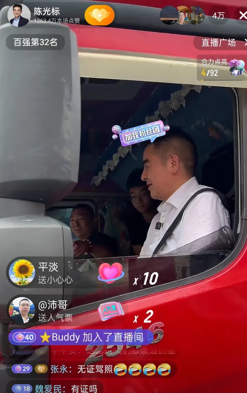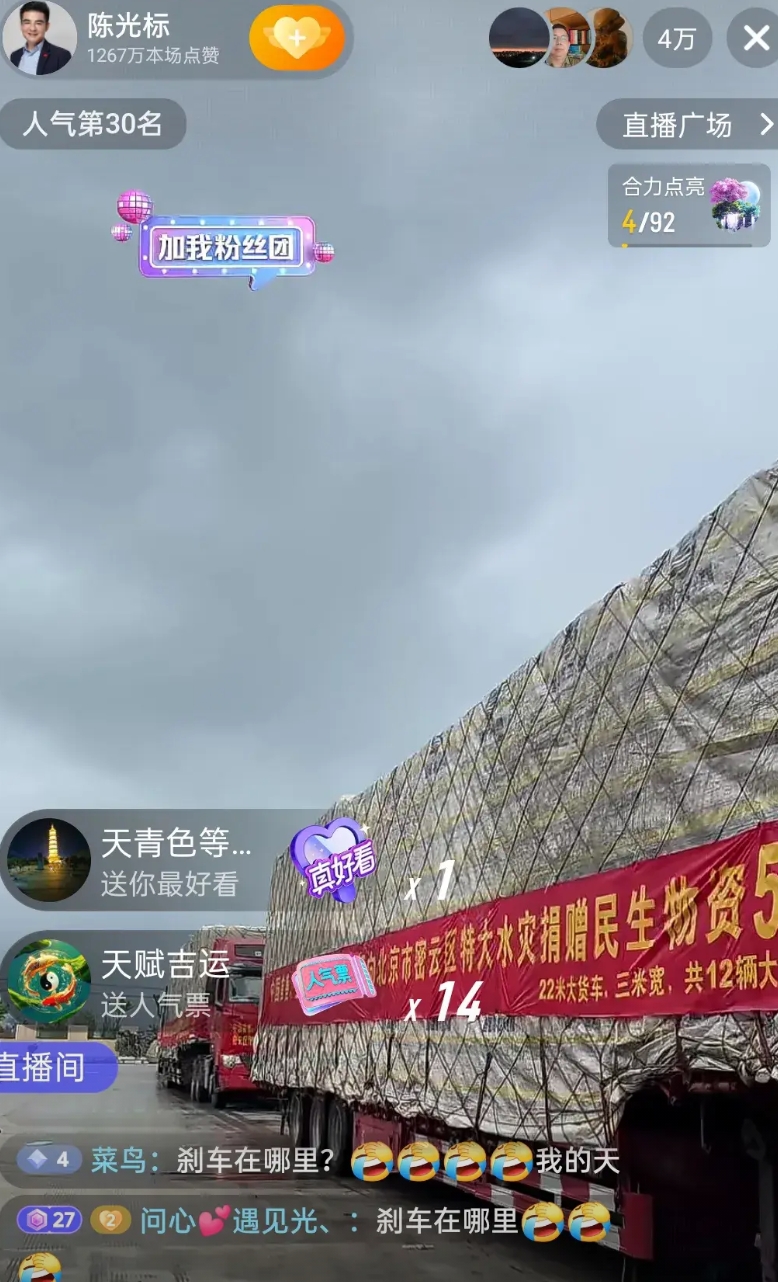 刚才刷到陈光标直播给北京密云水灾区捐赠5000万民生物资。快要出发的时候,他让前面那辆车的司机下来,说要自己亲自开大货车押送救灾物资。