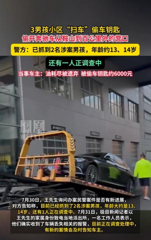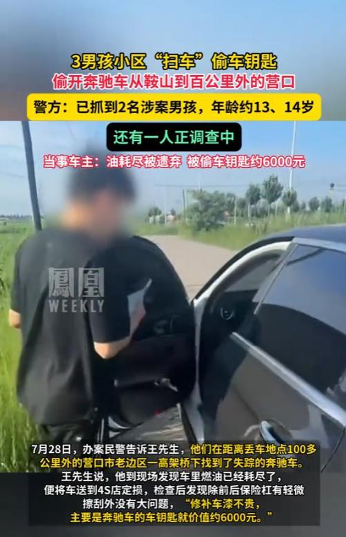 “熊孩子真该打了!”7月27日,辽宁,3名男孩在小区停车场“扫车”,拿走车钥匙,偷开奔驰车从鞍山到百公里外的营口,而几名男孩的年龄也就13岁左右,好在,其中2名男孩已经被抓,网友:必须得严惩! 事情是这样的,当天凌晨5点多,男子本来挺高兴,打算早点出门钓鱼,可他走到小区停车场一看,顿时懵了,停在这儿的丰田车车门敞着,车里的一条烟、300块现金,还有旁边奔驰车的钥匙全没了! 更让他头皮发麻的是,奔驰也不见踪影了,这是他5年前买的,被偷钱的车是最近才买的,本来是换着开的,就因为开惯了奔驰的自动锁,换车后顺手忘了锁门,没想到出了这档子事。 他赶紧报了警,警察调了监控,画面看得清清楚楚,凌晨3点多,三个半大孩子在停车场里,一个个试,拉到男子的车时,门一下就开了,他们在车里翻出奔驰钥匙,没多久就找到停在不远处的奔驰车。 后来居然就这么把车开走了,要说这几个孩子胆儿是真肥,最大的14岁,最小的才13岁,连驾照都没有,竟然敢开着车跑长途,第二天,警察在100多公里外的高架桥下,找到了那辆奔驰车。 车里的油都跑光了,前后保险杠蹭掉了点漆,不算太严重,但男子心疼坏了:“补漆花不了多少钱,可奔驰车钥匙配一把就得6000块啊”,现在两个孩子已经被抓住了,还有一个在找。 不得不说,这些小孩简直是胆大包天,必须严惩,不然以后还得惹大祸,说到底,孩子不懂事,家长的责任跑不了,这么大的孩子,正是管的时候,不管好,今天敢偷车,明天指不定能干出啥更危险的事。 这回没出大事算是万幸,真得好好教训教训,让他们知道啥叫规矩。 信息来源:《3男孩小区“扫车”偷车钥匙,偷开奔驰车从鞍山到百公里外的营口。警方:已抓到2名涉案男孩,年龄约13、14岁,还有一人正调查中。当事车主:油耗尽被遗弃 被偷车钥匙约6000元。》凤凰