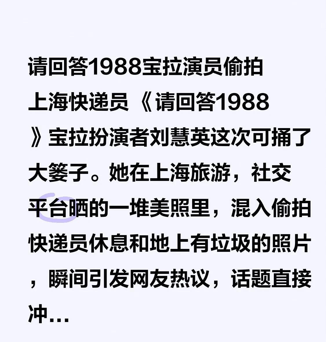 请回答1988宝拉演员偷拍上海快递员 《请回答1988》里宝拉的扮演者刘慧英这次可是惹了大麻烦。她到上海游玩,在社交平台晒出的众多美照当中,夹杂着偷拍快递员休息以及地上有垃圾的照片,一下子就引发了网友们的热烈讨论,这个话题更是径直冲上了热搜第一名。 不少网友认为,她这是在精致的自拍里故意加入底层劳动者和垃圾的镜头,这不但侵犯了快递员的隐私,还在“选择性地展示中国负面形象”,去迎合外界对中国的刻板印象。要知道在韩国,对肖像权可是非常敏感的,她这样的行为简直就是“双重标准”。有律师表示,如果快递员进行维权的话,她或许会面临肖像权诉讼。尽管她已经删除了帖子,可是并没有公开回应,这种态度真的是让人#探房lisa# 很无语。 #吴慧拉试衣#