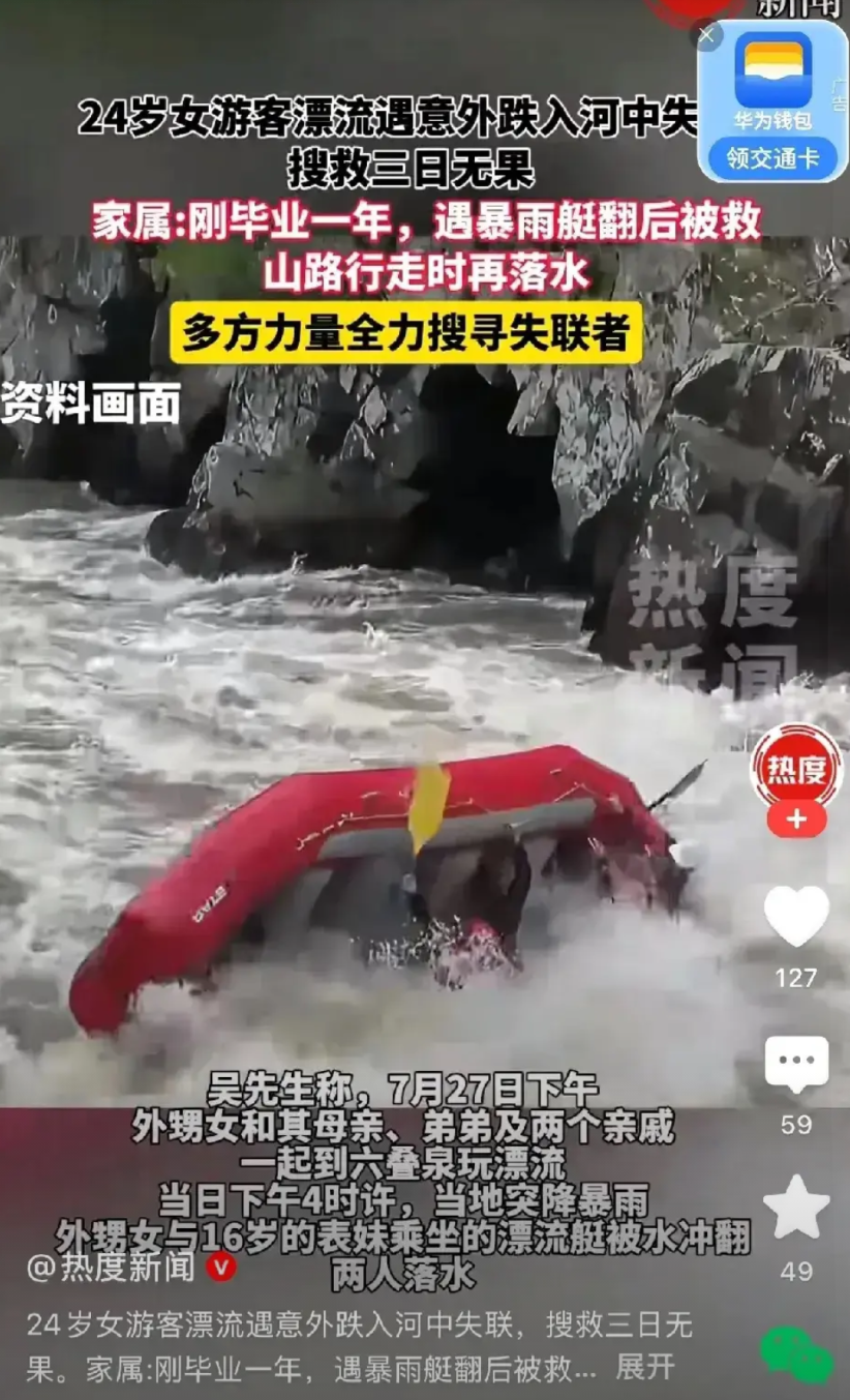 漂流那个水特别大,救生衣也不好使,可能是卡在那个石头缝里起不来了。