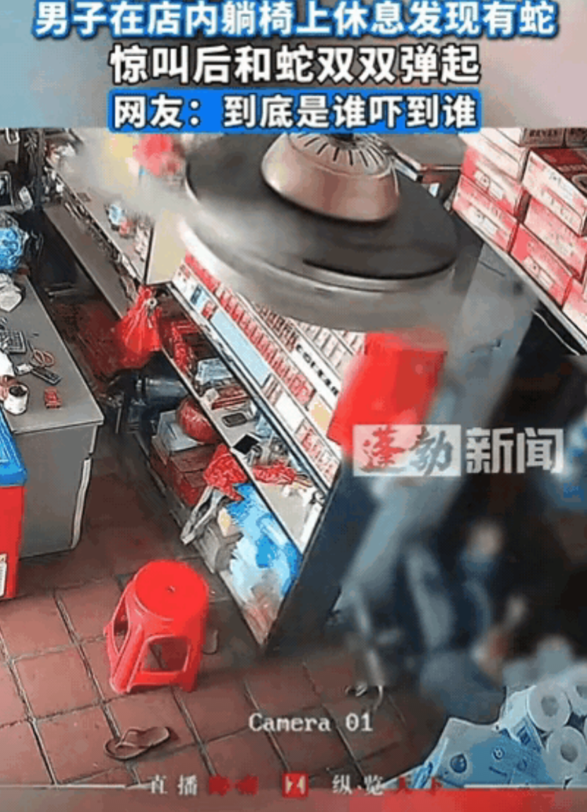 广东有一男子在超市看店,躺在靠椅上休息时,没想到前后晃动之时,男子不经意间看到了一条蛇。蛇的出现,把男子吓得从靠椅上摔了下来。就在这当口,蛇也猛地蹿了起来,随即转头向后逃窜。网友:这到底是谁吓谁呀?