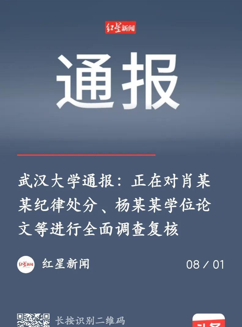 “武汉大学性骚扰案”风波难平, 武汉大学的通报终于来了,正在对肖某某纪律处分、杨某某学位论文等进行全面调查复核。前段时间大连工业大学对违纪学生处理快速果断。