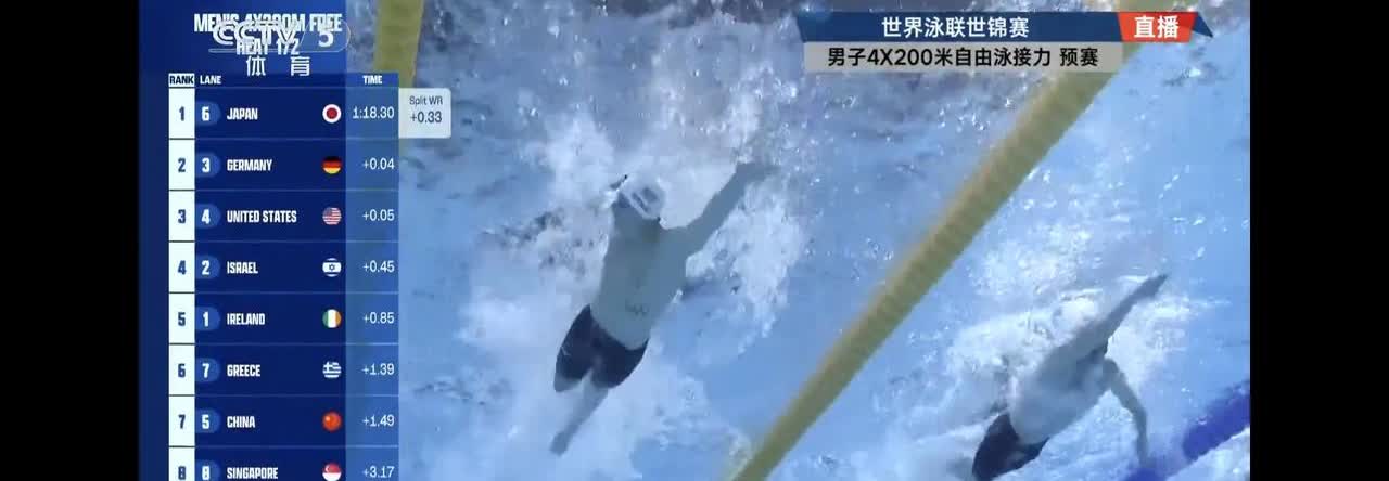 男子4×200米游泳接力, 第一棒:费立纬 1分46秒94,第5名交棒 第二棒:季新杰 1分46秒09,第3名交棒 第三棒:汪顺 1分46秒64,第2名交棒 第四棒:张展硕 1分46秒48,第2名完赛 中国队总成绩7分06秒15,以第六名的成绩进入晚上的决赛。 不出意外,晚上的决赛潘展乐应该会游最后一棒,不知道还会不会有奇迹发生,帮助中国队站上领奖台。