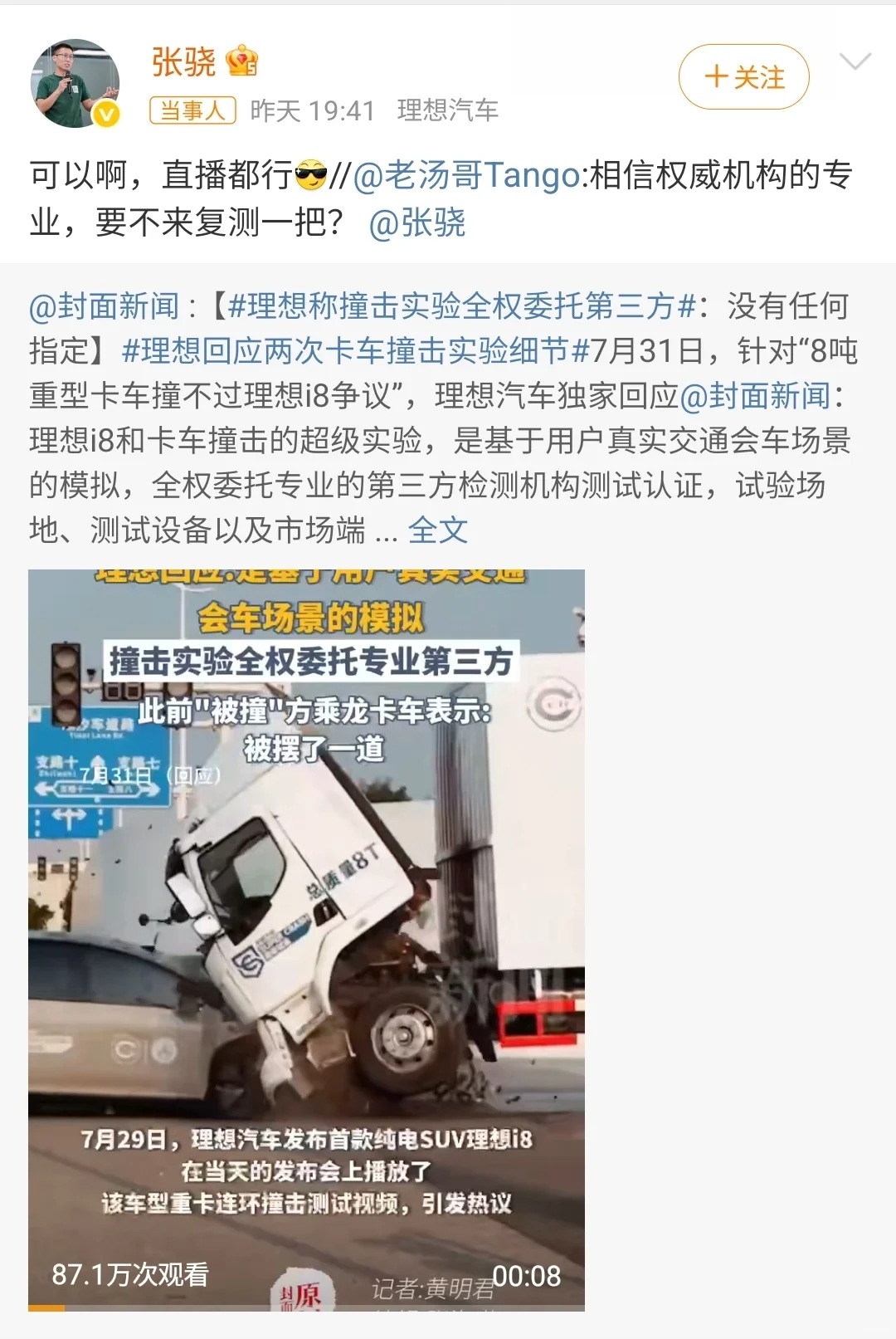 理想汽车产品负责人回应理想i8和卡车对撞事件:“相信权威机构的专业,要不来复测一把? @张骁 ”随后,张骁回应:“可以啊,直播都行。” i8发布,大量的流量都浪费在这了,无论你硬或是不硬,再撞还是不撞,面对持币观望的消费者,都可能错过最佳销售期,起势起不来,容易凉