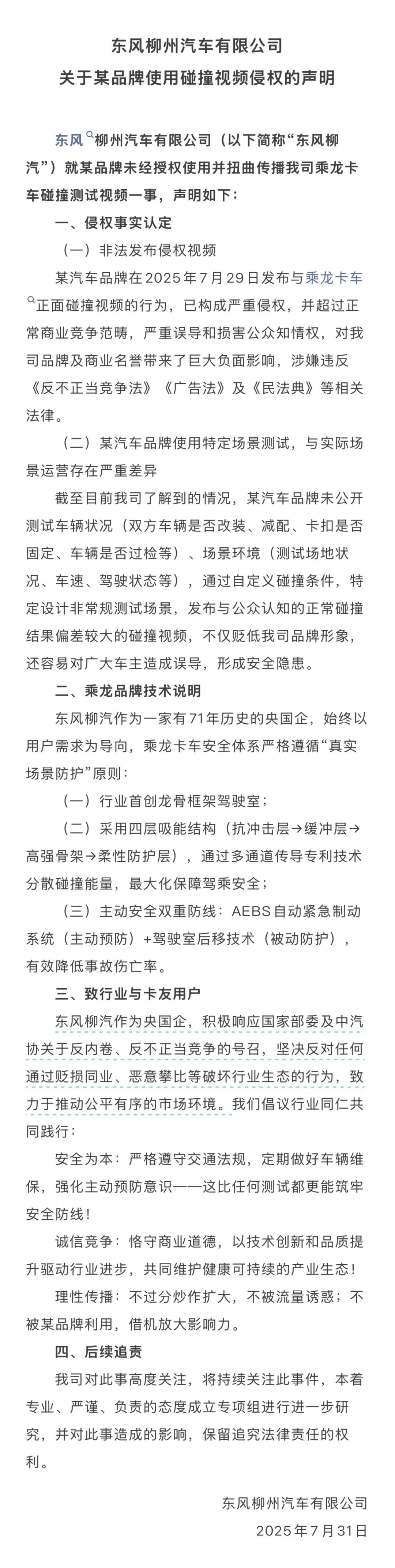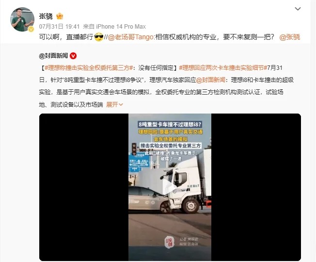 有着71年历史的央企东风柳汽,针对某品牌发布的与乘龙卡车正面碰撞视频,正式放出声明: 某品牌这操作真的迷惑,不仅没公开测试车辆状况、场景环境这些关键信息,还搞自定义碰撞条件,设计非常规测试场景,发布的碰撞视频跟正常结果偏差老大了!这不仅侵权,误导大家,还可能让车主觉得不安全,简直坑人嘛! 👉7月29日理想发布首款纯电SUV i8,发布会直接放了和乘龙卡车的对撞视频——8吨重卡被撞得四轮弹起,驾驶室和货箱都分开了,车头差点压到i8前窗上! 👂这事儿立刻炸锅!乘龙卡车下场怼:“被摆了一道,聪明人一眼看出假”,还说法务已经在处理了!😠 🙀但理想这边也很刚,说测试是委托中国汽研做的,场地、设备、连卡车都是第三方提供的,模拟的是真实会车场景。 👊中国汽研也出来说话,说测试完全符合标准,没帮着调参数,卡车还是全新的