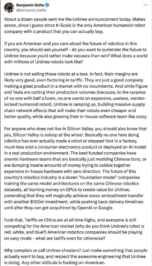 字里行间,话里话外,都能感受到美国这位机器人行业的从业者,对老美机器人行业的绝望,对同行的不满和愤怒,还有对宇树、以及中国机器人产业的羡慕和尊重。