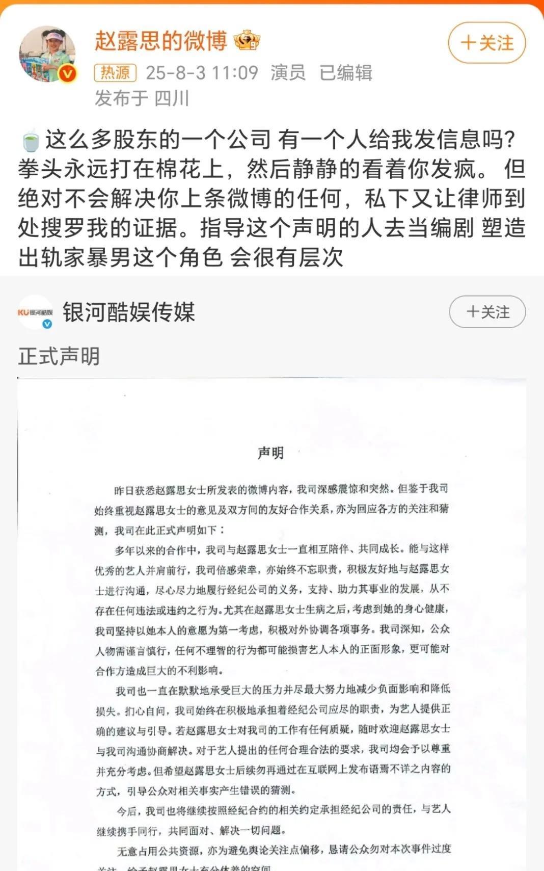 如今双方摆开决战阵仗,赵露思手握实证硬刚十年“卖身契”,银河酷娱却还在玩文字把戏。这场解约拉锯战,到底谁更占理?