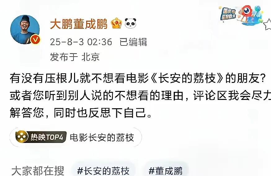 《长安的荔枝》票房拉垮,没想到大鹏凌晨两点半开始行动了! 昨天凌晨两点半,大鹏发文问网友:有没有不想看《长安的荔枝》的朋友?可不可以说说到底是什么原因让你不想看?我也好好反思一下自己! 截止现在,他导演的《长安的荔枝》票房刚过6亿,据说还没有回本。作为出品人和导演的他,自然有压力。 一直有一个问题,大鹏所有的电影,都好像差一口气。明明选题不错,立意也不错,演的其实也不错,但是就是离好片差一口气,挺神奇的。 对于大鹏的提问,很多网友提出了不少意见。