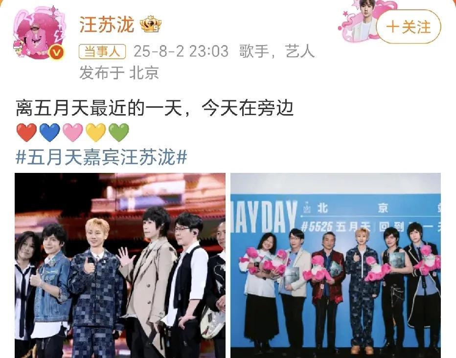五月天演唱会嘉宾汪苏泷! 8月3日凌晨,汪苏泷还没睡,在社交平台晒出了担任五月天[ 回到那一天 ] 25周年巡回演唱会嘉宾的视频,重温当晚的演唱会。 视频中阿信唱着《任性》,然后转身等待,汪苏泷从楼梯上走下,开始演唱,变成了新曲目《像晴天像雨天任性》,好有意思。当晚合唱了好几首歌,唱了《天使》。 确实好多惊喜,在聊天环节,还聊起送汪苏泷歌曲《超人》版权,还说“以后你可以来收钱,这首歌你爱怎么唱怎么唱”…这玩笑开的有点赚[偷笑][偷笑][偷笑]阿信说:“今天还没追踪汪苏泷的,回去通通追踪起来…”还帮忙拉人,真的是毫不吝啬…可爱的五月天。