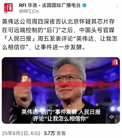 有没有想过,约谈英伟达的后门问题就是一个最牛的阳谋! 黄兴高采烈宣布,要把剩余库存的H20高价卖给我国的十几家公司,价值远超160亿美元。 关键是,这种做法是老美官方支持的,于是乎我们只用一个方法就完全拒绝了英伟达的美梦。 “后门”这是人为设置的,也是美公司普遍存在的,只要需要,随时可以被美安全部门使用的。 英伟达你来自己证明一下,你没有后门,这可以说是最大阳谋,如果想证明H20没有后门,那么需要把所有东西都放到桌面上,无论硬件还是软件。 只是,英伟达对H20阉割后,有些限制本身就是一种随时插手程序,也大可能就是传闻中的“后门”,这就尴尬了吧。 除非把能够在北美操控已经售出的H20甚至H100都被爆出过有的设计缺陷,全部公开。 那也就证明英伟达阉割版的H20一定存在后门,包括美官方说的远程关闭和追踪定位等手段在内。 所以,黄的算上打错了,他以为的大卖,结果被我国官方一个约谈拒之门外。 网友评论: