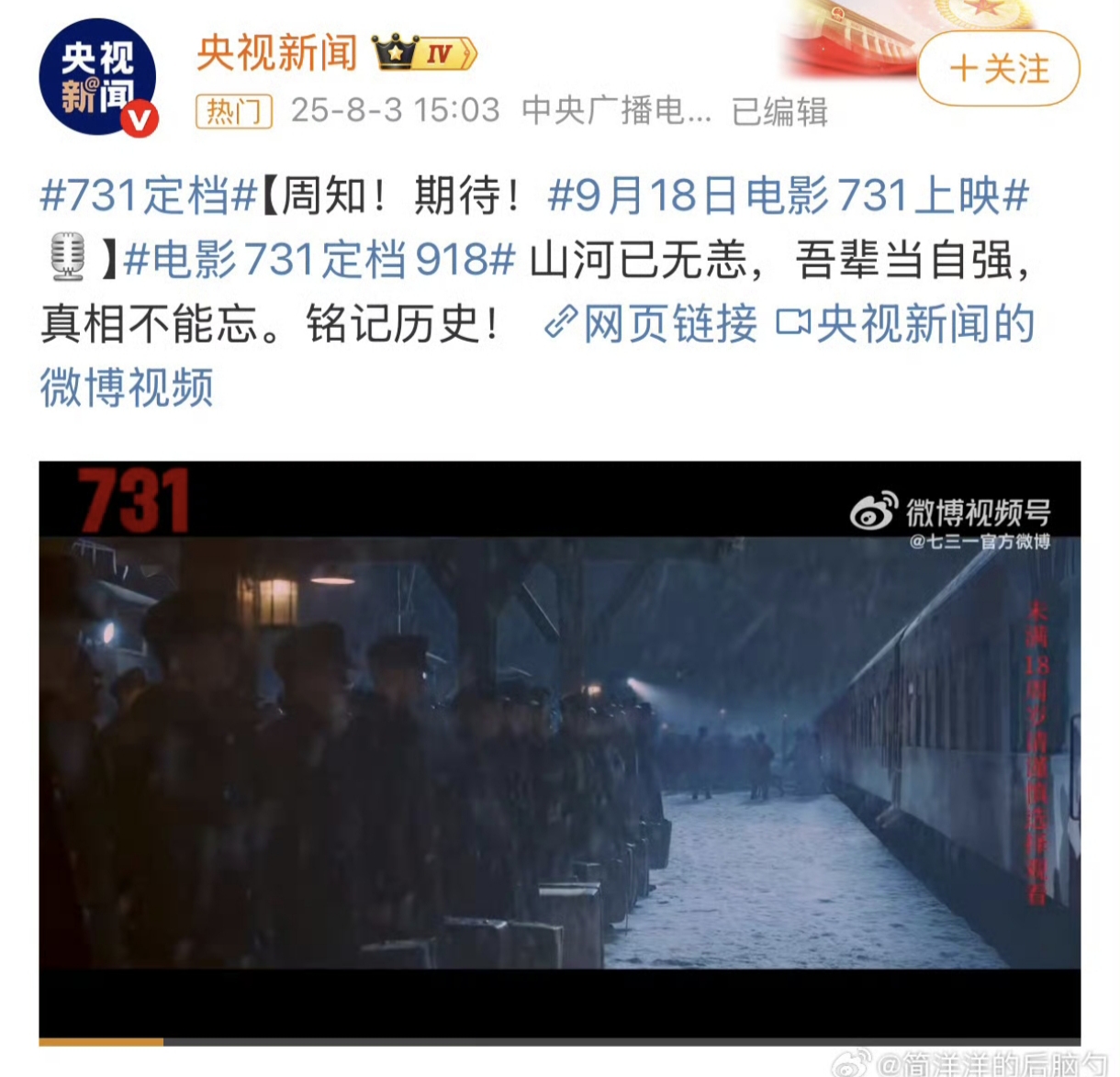 8月3日,央视突然官宣电影《731》定档9月18日,官博随即发布海报,配上“铭记历史,勿忘国耻”和“以光影抵抗遗忘,捍卫真相”的文字。 该片选在9·18这个特殊日子,显然是为了呼应93年前日本关东军侵华的历史,而影片聚焦的正是侵华日军731部队用活人做细菌实验的罪行。 这片子之前动静不小,去年就说要在今年7月31日“全球预映”,结果到时间没任何声响,连撤档通知都没有,让大家很是疑惑。如今改到9月上映,有人猜测可能是手续没办妥,像龙标、密钥这些,也有人觉得或许和日本方面的压力有关,之前就有日本外务省抗议的传言。 影片讲的是抗战接近尾声时,731部队在哈尔滨拿老百姓做细菌实验的黑暗历史。导演赵林山筹备多年,查了大量资料,还去731遗址取景拍摄。演员阵容有姜武、王志文、李乃文这样的实力派,没用流量明星。 虽然还没上映,这部片子热度很高,猫眼“想看人数”有384万,淘票票208万,在暑期档里排第一。 不少观众表示“这段历史必须记住”“再血腥也得看”,尤其是年轻人,有调查显示00后里只有20%知道“马路大”(活体实验受害者代号),这部电影或许能填补这部分历史认知的空白。 沉寂近一个月的《731》突然定档918,显然是想用电影警醒人们铭记历史。尽管之前的操作让人不解,但观众认可度很高,毕竟731部队的罪行不容遗忘。
