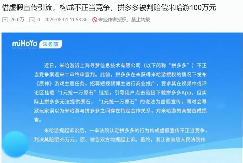 终于有人整治拼多多提现了 曾经的砍一刀,是多么的火热,你们以为再邀请一个好友就能提现,谁知道小数点的后面还有6个数字。 不过,已经有公司开始整治它。原因是拼多多在未获授权情况下,发布游戏主题任务,引导用户点击链接下载拼多多App。 同时未能提供游戏中原石,米哈游法务直接出手,二审拼多多赔100万,你们怎么看?