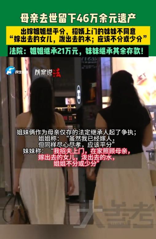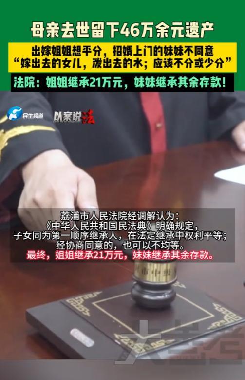 “这就是现实!”广西荔浦,一女子因车祸意外去世,留下了46万元遗产,结果,小女儿以姐姐出嫁为由,不愿意平分遗产,她直呼:嫁出去的女儿,泼出去的水!而大女儿却认为同样尽孝心,应该平分,最终,姐妹二人闹上法庭。 常说“亲兄弟明算账”,可真到了分家产的时候,亲姐妹也可能闹得脸红脖子粗。 事情是去年11月的事,俩姐妹的母亲出了车祸,没等到抢救就走了,一点准备都没有,更别说留下啥遗嘱了,办完丧事后,家里人整理遗物,才发现老人银行账户里存着46万块钱,这可是老人一辈子攒下的养老钱。 按说妈不在了,这笔钱该姐妹俩商量着分,可小女儿一开口,大女儿就愣了,小女儿说自己是招了上门女婿的,这些年一直跟母亲住一块儿,端茶倒水都是自己伺候,这钱理当全归她。 至于姐姐,早就嫁去别的地方了,按老辈人说的“嫁出去的女儿,泼出去的水”,根本没资格分,大女儿听了这话,眼泪当时就下来了,她委屈地说,自己虽然嫁得远,但逢年过节从没落下过。 平时隔三差五就买东西回来,母亲生病住院时,自己也是请假守在床边,怎么就没资格分遗产了,“都是妈的闺女,凭啥我尽了孝却分不到钱”,姐妹俩你一言我一语,从家里吵到亲戚面前,谁也说不服谁。 亲戚们劝了好几次,说都是亲姐妹,各让一步算了,可俩人都拧着一股劲,最后只能闹到法院去,法院的人听完俩人的说法,又找邻居了解了情况,很快就有了说法,法官说,老人没留遗嘱,那遗产就得按法律来分。 不管闺女嫁没嫁人,都是法定继承人,跟是不是招上门没关系,再说大女儿确实尽了孝心,分遗产合情合理,今年7月,法院从中调解,最后俩人总算达成了协议,姐姐分21万,剩下的25万归妹妹。 虽然事情解决了,但姐妹俩心里那道坎,估计没那么容易过去,这事传到村里,有人说老规矩得守,也有人说现在是新社会,男女都一样,其实说到底,亲情比钱金贵,为了这点钱伤了和气,真不值当。 信息来源:《母亲车祸去世 留下46万元遗产妹妹以姐姐出嫁为由不同意平分妹妹:我招夫上门照顾母亲“应全部继承”》大参考