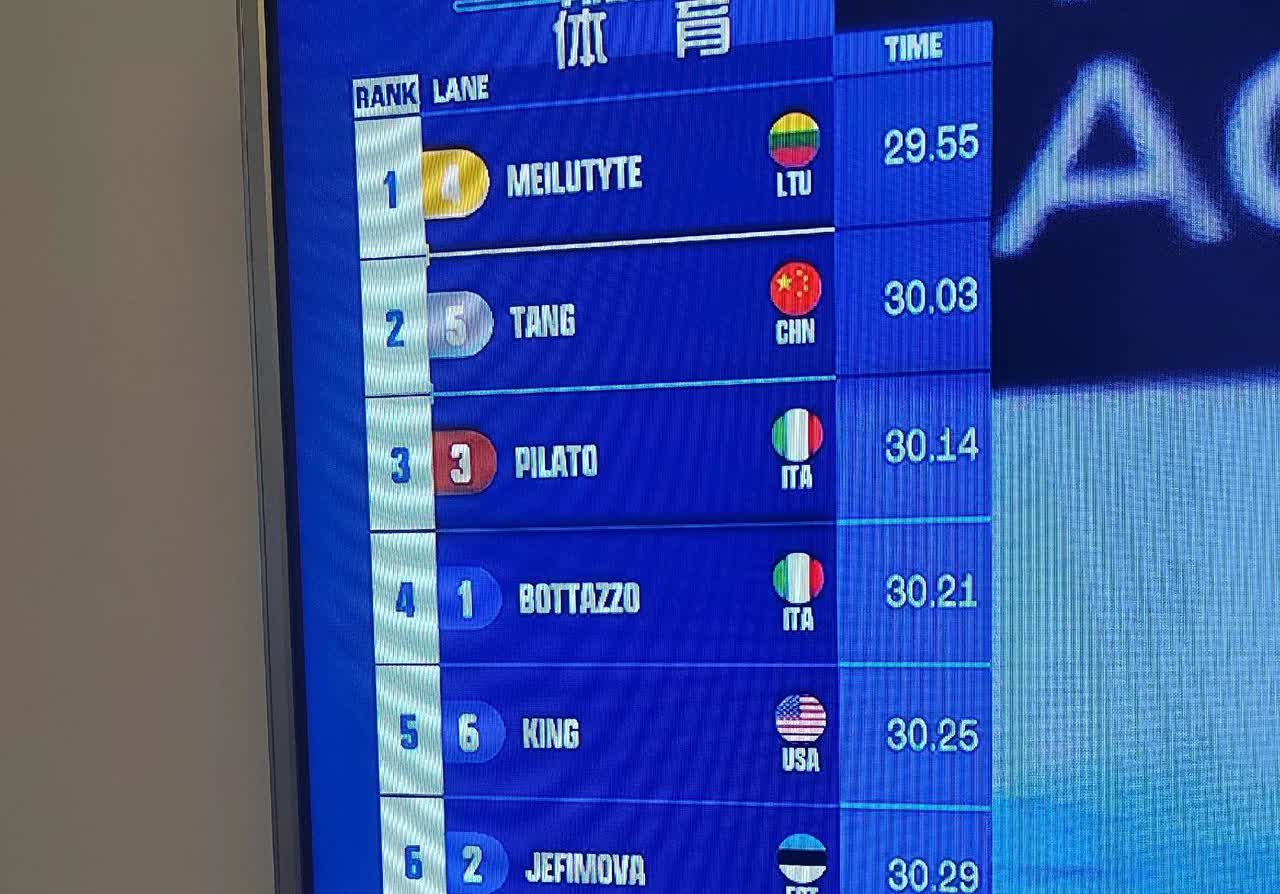 2025年游泳世锦赛收官之战:在刚刚结束的女子50米蛙泳决赛中,我国选手唐钱婷以30秒03的成绩获得了一枚银牌,冠军被立陶宛名将梅卢提特获得,成绩是29秒55,这是她在世锦赛女子50米蛙泳中获得的第四枚金牌,显示了她在女子这个项目无可撼动的统治地位。 唐钱婷是以预赛第二名的成绩进入决赛的,今天的决赛游出的成绩30秒03比半决赛的30秒04快了0.01秒!遗憾的是,梅卢提特发挥更为出色,她获得金牌可谓实至名归。