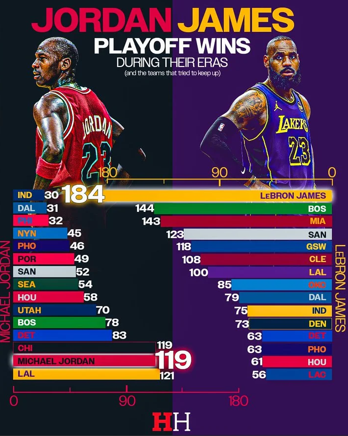 美媒HoopsHype更新社交媒体,晒出迈克尔-乔丹与勒布朗-詹姆斯各自的季后赛