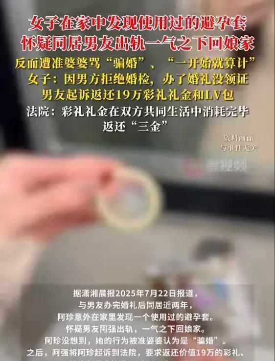 湖北孝感,女子在家中发现一只使用过的避孕套,怀疑同居男友出轨,一气之下回了娘家。结果没想到,女子的行为被准婆婆认为是 “骗婚”,要求女子返还价值 19 万的彩礼。双方沟通未果,女子被男友告上了法庭,法庭这么判! 阿珍和阿强的故事始于 2022 年的一次相亲。媒人介绍时,阿强的母亲特意提到儿子 “踏实肯干”,阿珍则被夸 “贤惠持家”。 见面那天,阿强穿着熨烫平整的衬衫,带阿珍去了镇上最好的餐馆。 席间,他细心地把鱼刺挑干净,说 “我妈说找媳妇就得找你这样的”。 阿珍笑了,觉得这个男人带着长辈的叮嘱,透着股实在的温度。 恋爱进展得很快。阿强隔三差五给阿珍送水果,帮她家里修水管;阿珍则给他织毛衣,周末做他爱吃的红烧肉。 半年后,阿强的母亲送来三金,沉甸甸的金镯子套在阿珍手腕上时,准婆婆说:“早点把证领了,我就安心了。” 阿珍没说话,心里却犯嘀咕 —— 她听说阿强的前女友曾因健康问题分手,想先做个婚检,可话到嘴边又咽了回去。 婚礼是在 2023 年 10 月办的。酒席摆了二十多桌,阿强抱着阿珍转圈时,她听见他在耳边说:“以后咱就是一家人了。” 可当晚,阿强却以 “喝多了” 为由,睡在了客房。阿珍盯着空荡荡的婚床,想起准婆婆白天说的 “女人要懂得体谅”,把疑问吞进了肚子。 同居的日子平淡却暗流涌动。阿强经常以 “加班” 为由晚归,阿珍发现他的衬衫上偶尔有陌生的香水味。 她试着沟通,他却不耐烦:“结了婚还这么多疑,累不累?” 两人开始分房睡,阿珍的枕边,渐渐落满了无声的泪水。 2025 年 5 月的那个傍晚,改变一切的避孕套出现在卫生间垃圾桶里。阿珍盯着那团皱巴巴的乳胶,手不受控制地发抖。 她想起上周阿强说 “朋友来家里喝酒”,想起他最近频繁删除手机聊天记录,所有的怀疑在这一刻炸成碎片。 她抓起行李箱冲出门时,听见阿强在身后喊:“你发什么神经!” 回娘家的路上,阿珍给准婆婆发了条 “有缘无分”。她以为会得到安慰,没想到等来的是劈头盖脸的指责:“难怪婚前不肯领证,原来早有算计!” 准婆婆的话像耳光,打得她头晕目眩。她这才惊觉,这场持续两年的 “婚姻”,从头到尾都悬在一张未领的结婚证上。 法庭上,阿强的律师展示了阿珍的嫁妆清单:两万元存折、全套家电。“这些远不及男方的付出。” 律师的声音冰冷,“女方拖延领证,明显存在骗婚故意。” 阿珍攥着医院的诊断书 —— 上面写着 “焦虑症,与情感压力相关”,突然想起恋爱时阿强说的 “我养你”,如今都成了刺人的讽刺。 阿珍的代理律师拿出了关键证据:2024 年 3 月的聊天记录里,阿珍多次提到婚检,阿强始终回避。 2025 年 4 月的通话录音中,他在电话里怒吼:“婚检就是不信任我!” 这些碎片拼成了一个残酷的事实:所谓 “骗婚”,不过是男方逃避责任的借口。 法官的判决来得很慢。他仔细核对了彩礼的使用情况:三金被阿珍收在娘家保险柜,10 万元彩礼用于装修婚房和日常开销,LV 包早已磨损褪色。 最终,他依据最高法 2024 年新规,结合两人同居近两年的事实,判决阿珍返还三金,其余不予支持。 宣判当天,阿珍站在法院门口,阳光刺眼。阿强的母亲冲过来骂 “骗子”,被法警拦下。 阿珍看着曾经熟悉的一家人,突然觉得陌生。她想起婚礼那天,阿强在誓词里说 “无论疾病贫穷,都不离不弃”,可现实里,一枚避孕套就能让两年感情土崩瓦解。 这场风波后,阿珍删掉了阿强所有联系方式。她在日记本上写道:“彩礼是婚姻的试金石,可真正考验感情的,是愿意为对方敞开心扉的勇气。” 而阿强在收到三金时,或许也会想起那个在樱花树下笑靥如花的姑娘,只是有些信任,一旦破碎,就再难拼凑完整。 法院的判决没有偏袒任何一方,它只是用法律的尺子,丈量了一段感情的重量。 这场因避孕套引发的纠纷,最终以返还三金告终,却留下了一个深刻的警示:婚姻的基石是信任,而信任的建立,需要双方坦诚面对彼此的过去与现在。