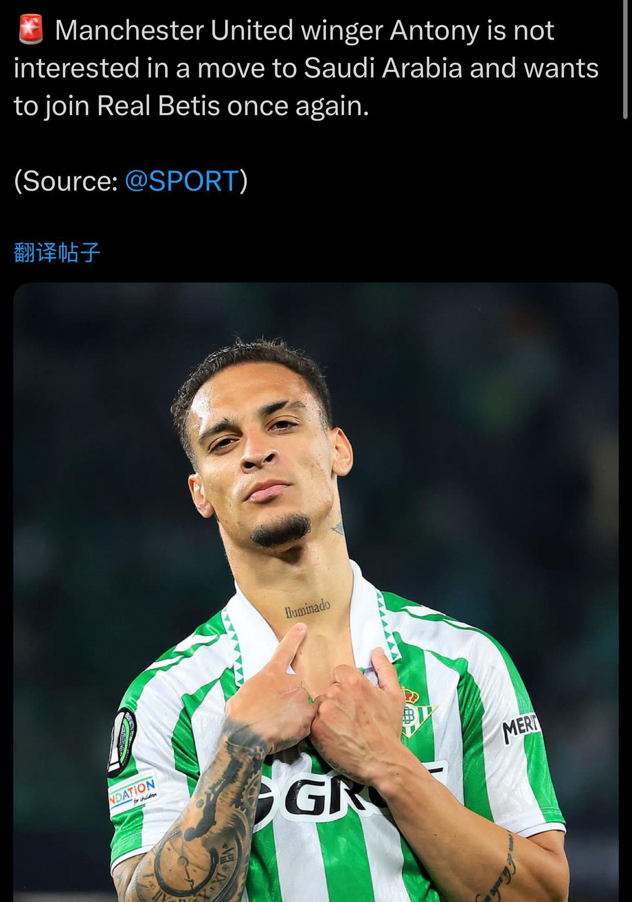 安东尼对转会沙特阿拉伯不感兴趣,他希望再次加盟皇家贝蒂斯。 我其实挺能理解他的,