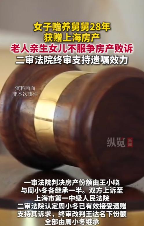 “大快人心!”上海,一女子赡养舅舅28年,舅舅临终前,立下遗嘱,其名下房产由外甥女一人继承,然而,其亲生女儿和外孙女不服,想要挣房产,将女子告上法庭,最终,法院判了,网友:判的好! 这事儿得从二十多年前说起,舅舅老伴儿走了之后,就一个人过日子,亲生女儿不管不问,外孙女也从没搭过手,反倒是外甥女,看着舅舅孤孤单单的,心里不落忍,干脆把舅舅接过来一起住。 这一住,就是28年。 平常家里的柴米油盐,头疼脑热看病取药,全是外甥女一手操办,舅舅年纪大了,行动不方便,端茶倒水、擦洗身子这些活儿,也都是外甥女亲力亲为,街坊邻居都看在眼里,都说这外甥女比亲闺女还贴心。 其实早在2001年,舅舅心里就有数了,他把名下的房子登记成外甥女和外孙女各占一半,可后来看着外甥女一天比一天尽心,自己的亲闺女却连个电话都少得可怜,心里慢慢有了别的想法。 2009年,他特意去立了遗嘱,明明白白写着,这房子将来全归女子一个人,2020年老人走了,这遗嘱一拿出来,他的亲生女儿和外孙女不乐意了,她们觉得自己才是正经的亲人。 这房子没道理给女子,于是把女子告到了法院,说这遗嘱不算数,法院开庭的时候,街坊邻居好多人都去作证,说这28年全是女子在照顾老人,法官一看证据,又查了公证遗嘱的手续。 最后,舅舅的房产,全部由外甥女继承,不得不说,早就该这样,谁真心待老人,谁就该得这份心,28年啊,不是三天两天,这份情分比啥都重,这判决合情合理,让好人不白付出,也给那些不孝顺的人提了个醒。 其实过日子就是这样,人心换人心,对老人好,老人心里都有数,这房子不光是套房子,更是一份公道。 信息来源:《女子赡养舅舅28年获赠上海房产,老人亲生女儿不服争房产败诉。》纵览新闻