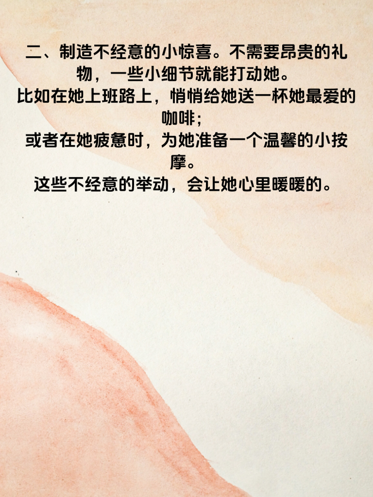 一、真心关注她的生活。想要让她心动,首先得走进她的世界。平时多留意她分享的点滴,无论是朋友圈的动态,还是日常聊天中提及的事情。比如她提到最近喜欢一本书,那就赶紧去读一读,这样下次聊天就能有共同话题,让她感受到你对她的在乎。 二、制造不经意的小惊喜。不需要昂贵的礼物,一些小细节就能打动她。比如在她上班路上,悄悄给她送一杯她最爱的咖啡;或者在她疲惫时,为她准备一个温馨的小按摩。这些不经意的举动,会让她心里暖暖的。 三、耐心倾听她的心声。当她遇到烦恼或者开心的事,都愿意和你倾诉时,一定要耐心倾听。不要打断她,用专注的眼神和温柔的回应,让她知道你是她最可靠的听众。这样她会越来越信任你,感情也会升温。 四、尊重她的想法和选择。在相处中,尊重她的每一个决定。无论是吃什么、看什么电影,还是职业规划等大事,都要尊重她的想法。让她感受到自己是被平等对待的,而不是被强迫或者忽视,如此她会更容易对你心动。
