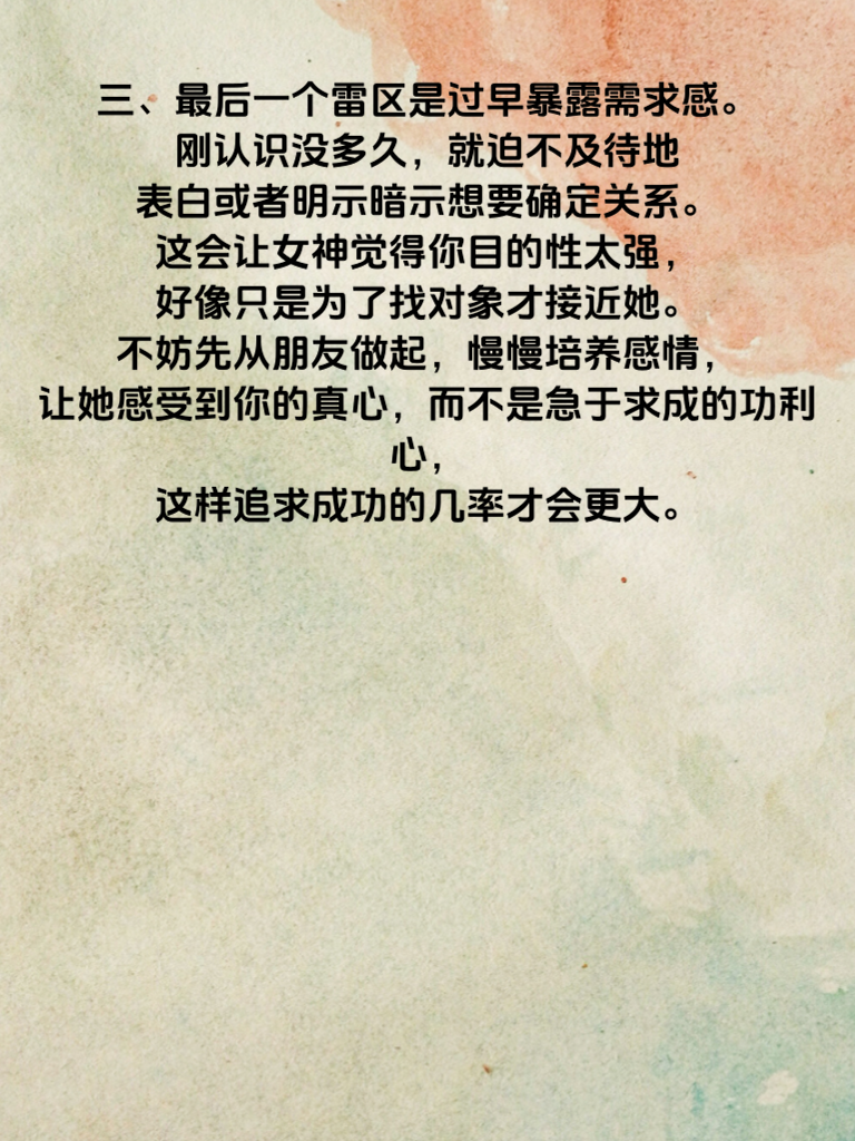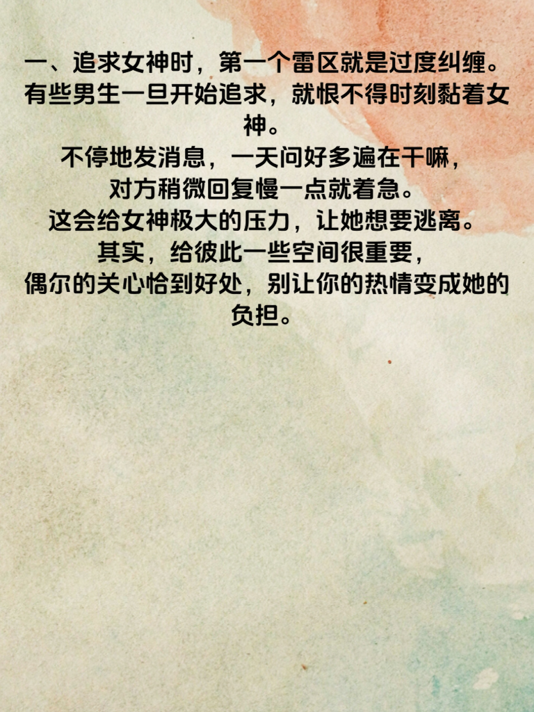 一、追求女神时,第一个雷区就是过度纠缠。有些男生一旦开始追求,就恨不得时刻黏着女神。不停地发消息,一天问好多遍在干嘛,对方稍微回复慢一点就着急。这会给女神极大的压力,让她想要逃离。其实,给彼此一些空间很重要,偶尔的关心恰到好处,别让你的热情变成她的负担。 二、第二个雷区是不懂装懂。为了在女神面前表现,明明对某个话题不了解,却硬要发表看法。结果漏洞百出,反而暴露了自己的浅薄。追求女神要真诚,遇到不懂的大方承认,然后虚心学习,展现出积极进取的态度,这样更能赢得女神的好感。 三、最后一个雷区是过早暴露需求感。刚认识没多久,就迫不及待地表白或者明示暗示想要确定关系。这会让女神觉得你目的性太强,好像只是为了找对象才接近她。不妨先从朋友做起,慢慢培养感情,让她感受到你的真心,而不是急于求成的功利心,这样追求成功的几率才会更大。