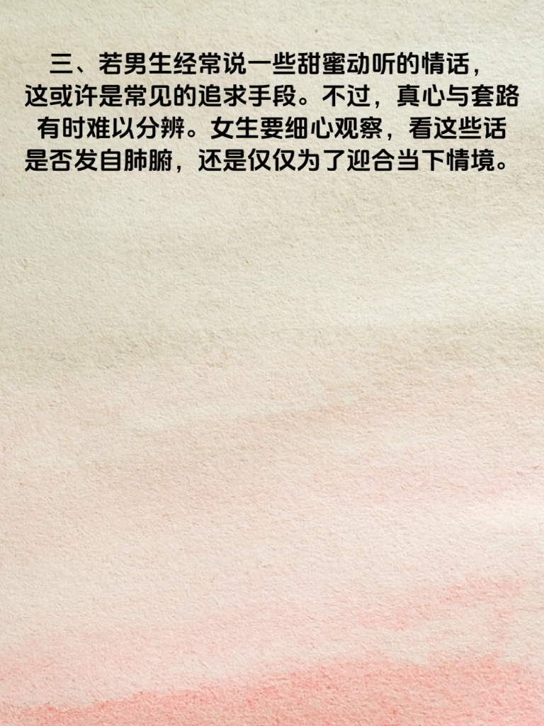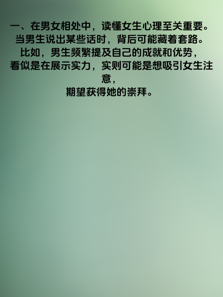 一、在男女相处中,读懂女生心理至关重要。当男生说出某些话时,背后可能藏着套路。比如,男生频繁提及自己的成就和优势,看似是在展示实力,实则可能是想吸引女生注意,期望获得她的崇拜。 二、还有一种情况,男生总是用幽默调侃的方式和女生交流。这既能营造轻松氛围,拉近彼此距离,但也可能是一种套路,用巧妙的玩笑掩盖内心的紧张与在意。 三、若男生经常说一些甜蜜动听的情话,这或许是常见的追求手段。不过,真心与套路有时难以分辨。女生要细心观察,看这些话是否发自肺腑,还是仅仅为了迎合当下情境。 四、另外,当男生说‘我懂你’时,女生得思考他是真的用心了解过自己,还是只是为了让关系更亲近而说的套路话。通过剖析这些话语背后的含义,女生能更好地看清男生的心思,避免陷入不必要的情感迷雾。