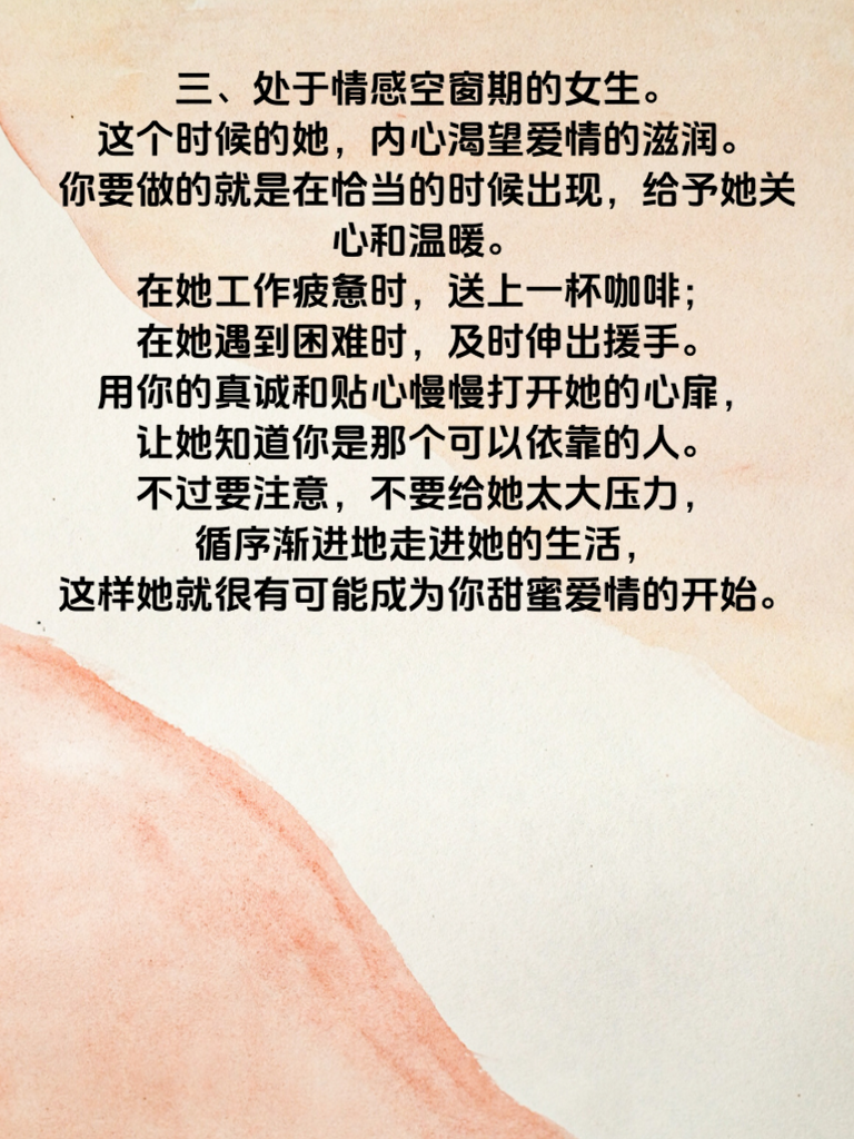 一、开朗热情型女生。这类女生就像小太阳,总是充满活力,对周围的人和事都保持着积极的态度。她们很容易和人打成一片,你只要勇敢地迈出第一步,主动和她交流,分享生活中的趣事,她会热情地回应你。在相处过程中,多组织一些有趣的活动,比如一起去看一场喜剧电影,或者参加户外运动,让她感受到和你在一起总是充满欢乐,那么她很可能就会被你的热情所感染,逐渐对你产生好感。 二、有共同兴趣爱好的女生。当你们拥有共同喜欢的事物时,那简直就是天赐良机。比如都热爱音乐,你可以约她去听音乐会,然后在结束后和她深入探讨对音乐的理解;要是都喜欢阅读,就互相分享最近读过的好书,交流彼此的感悟。通过这些互动,你们能更深入地了解对方,情感也会在一次次的交流中升温。她会因为你们有如此多的契合点,而觉得你就是那个懂她的人,从而更容易接受你的追求。 三、处于情感空窗期的女生。这个时候的她,内心渴望爱情的滋润。你要做的就是在恰当的时候出现,给予她关心和温暖。在她工作疲惫时,送上一杯咖啡;在她遇到困难时,及时伸出援手。用你的真诚和贴心慢慢打开她的心扉,让她知道你是那个可以依靠的人。不过要注意,不要给她太大压力,循序渐进地走进她的生活,这样她就很有可能成为你甜蜜爱情的开始。