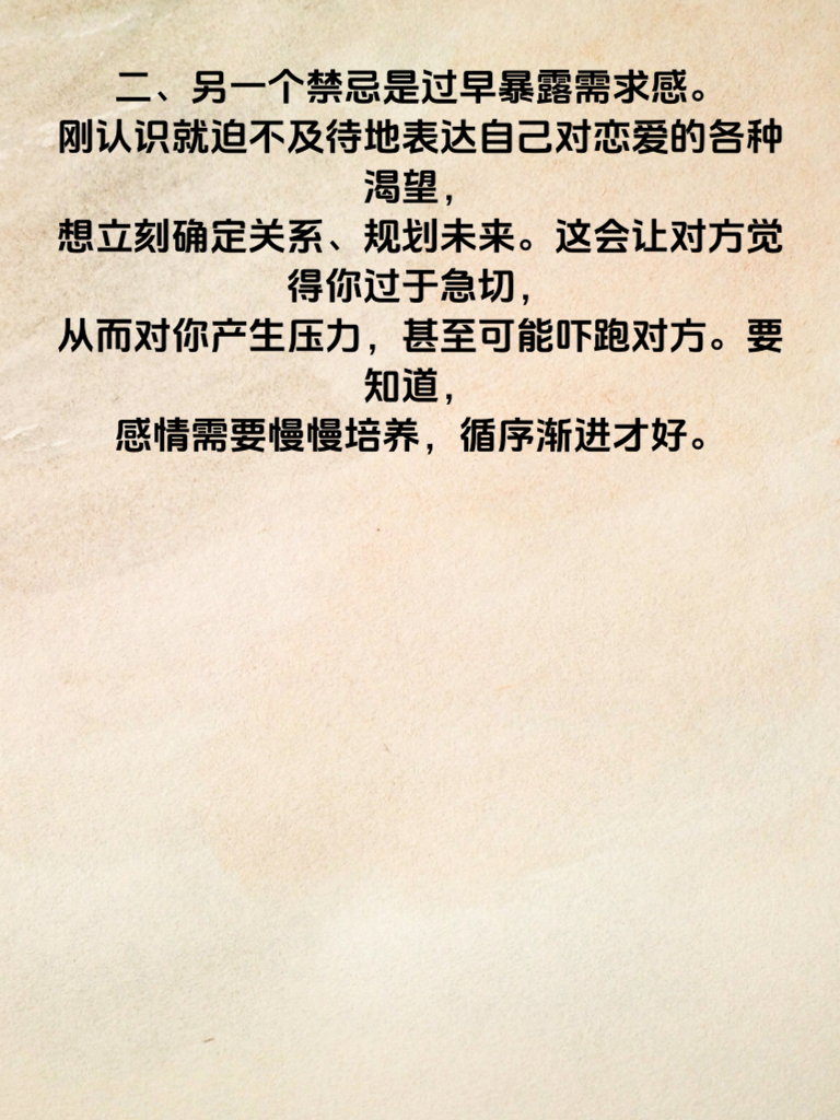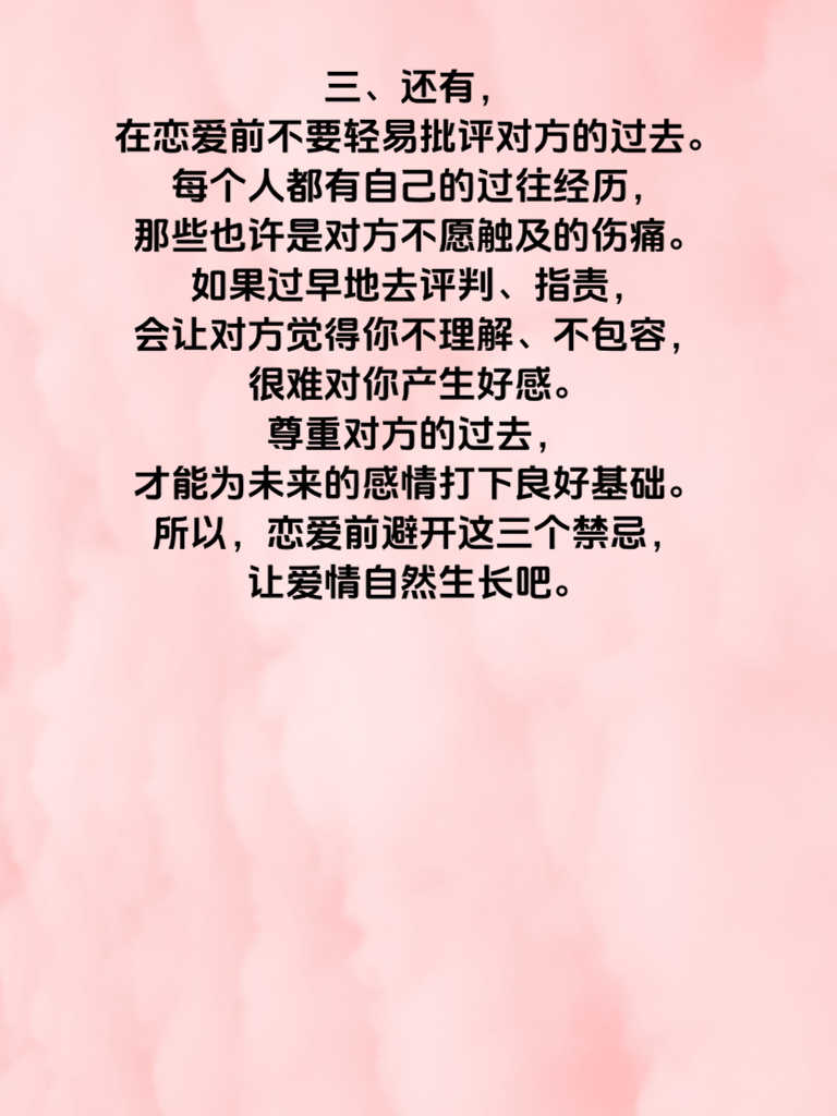 一、恋爱前,有些禁忌一旦触碰,真的可能会延误美好的爱情。其中一个禁忌就是过度试探。很多人在还没正式恋爱时,就喜欢不断去试探对方,比如故意不回消息看对方的反应,或者提出一些无理要求来考验。可这样做往往会让对方感到疲惫和不安,还没开始就给感情蒙上阴影。 二、另一个禁忌是过早暴露需求感。刚认识就迫不及待地表达自己对恋爱的各种渴望,想立刻确定关系、规划未来。这会让对方觉得你过于急切,从而对你产生压力,甚至可能吓跑对方。要知道,感情需要慢慢培养,循序渐进才好。 三、还有,在恋爱前不要轻易批评对方的过去。每个人都有自己的过往经历,那些也许是对方不愿触及的伤痛。如果过早地去评判、指责,会让对方觉得你不理解、不包容,很难对你产生好感。尊重对方的过去,才能为未来的感情打下良好基础。所以,恋爱前避开这三个禁忌,让爱情自然生长吧。