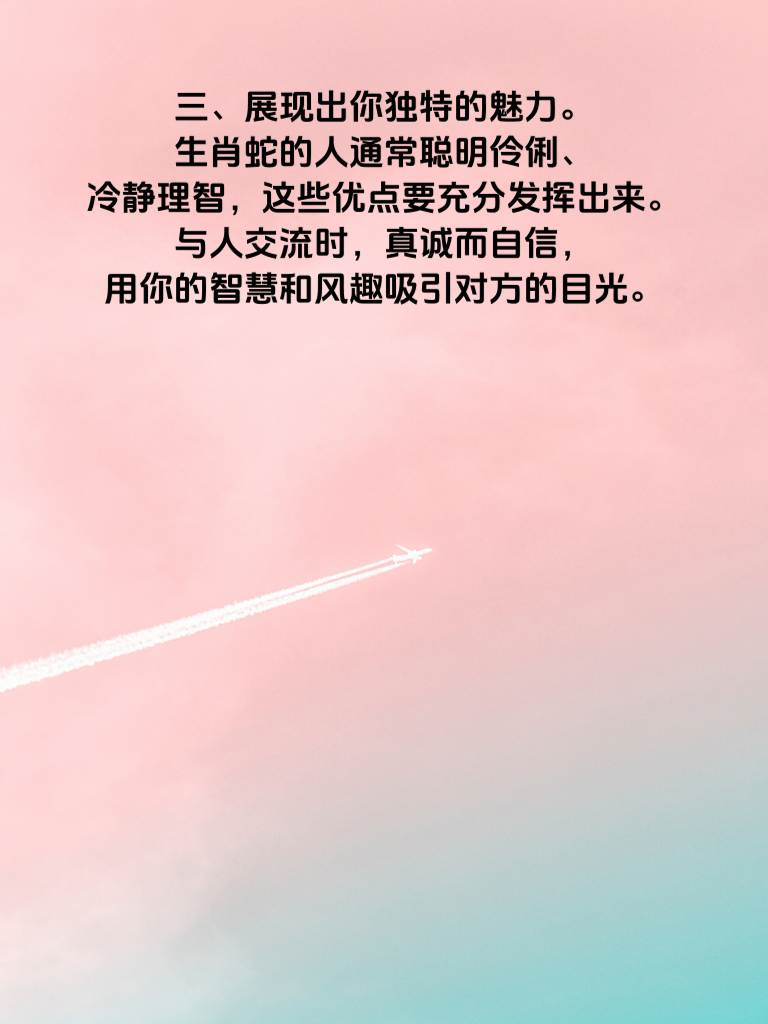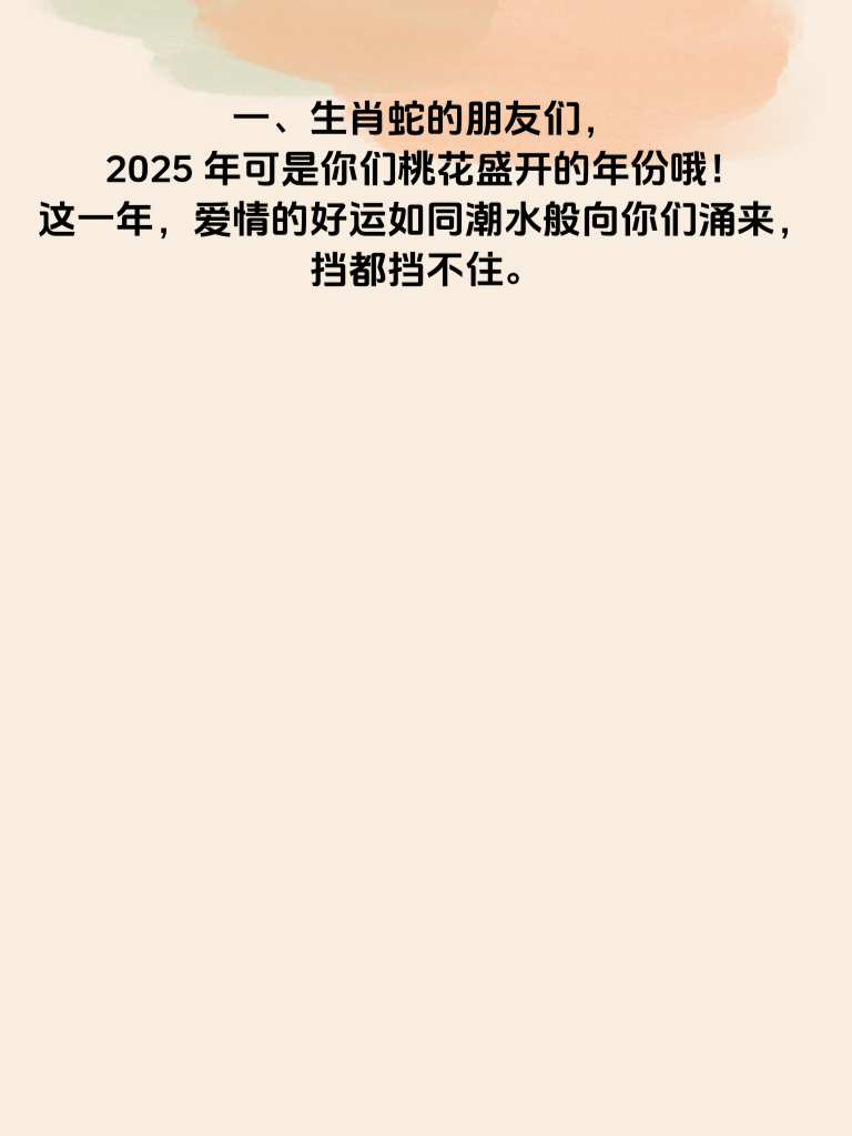 一、生肖蛇的朋友们,2025年可是你们桃花盛开的年份哦!这一年,爱情的好运如同潮水般向你们涌来,挡都挡不住。 二、在这充满机遇的一年里,要保持积极乐观的心态。主动走出自己的舒适区,多参加一些社交活动,扩大自己的社交圈子。说不定在某个转角,就能遇到那个让你心动的Ta。 三、展现出你独特的魅力。生肖蛇的人通常聪明伶俐、冷静理智,这些优点要充分发挥出来。与人交流时,真诚而自信,用你的智慧和风趣吸引对方的目光。 四、注重自身形象也是很关键的。整洁得体的外表会给人留下良好的第一印象。保持良好的生活习惯,让自己精神饱满,充满活力。 五、当遇到心仪的对象时,不要急于表白。先从朋友做起,慢慢了解彼此。在相处过程中,细心地关心对方,用你的温柔和体贴打动对方的心。相信在2025年,你们都能收获美好的爱情。