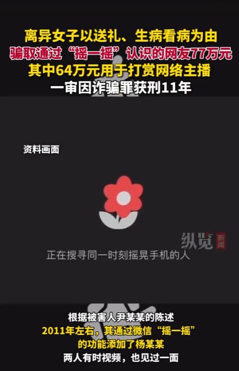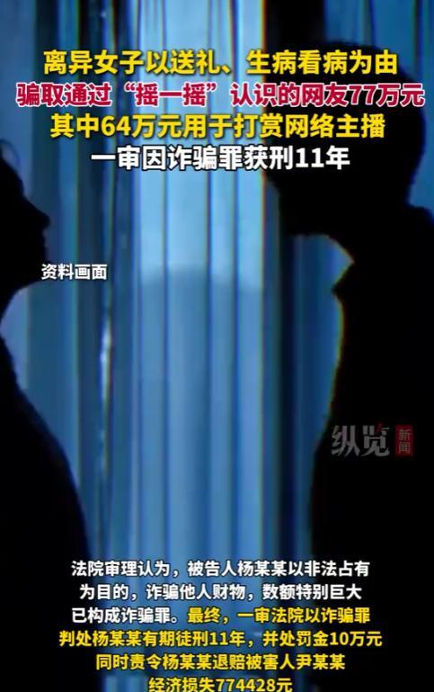 “太傻了!”天津,一女子在离婚后,因无生活来源,以送礼、生病等理由,骗取一网友77万元,其中64万元被女子用于打赏主播,网友发现后,将女子告上法庭,最终,法院判决女子刑期11年,罚金10万元,网友:这是怎么被骗的? 事情得从2011年说起,那会儿手机刚流行“摇一摇”加好友,这名女的就这么认识了被骗的男网友,俩人不光线上视频聊天,线下还见过一面,算是有点交情,到了2017年底,女的因为和丈夫过不到一块儿去,离了婚。 从2018年开始,她就频繁找男网友帮忙,今天说要还贷款,明天说没生活费,男的想着认识这么多年,也就一次次把钱转过去了,可到了2021年,这女的胃口越来越大。 一会儿说要给人送礼办事,一会儿又说自己生病住院急需用钱,甚至编瞎话说自己在上海有套房子,等把房子卖了就立马还钱,男的被这些话哄着,一笔笔钱接着往外拿。 谁知道,这些钱压根没用到正地方,女的自己承认,一部分钱用来还了之前的债和日常开销,剩下的64万,竟然全花在打赏网络主播上了,估计是在直播间里听着“谢谢大哥”“感谢姐姐”,心里头舒坦吧。 时间一长,男的慢慢觉得不对劲,说要卖房还钱,怎么迟迟没动静,说生病住院,也没见拿出像样的凭证,仔细一查,才发现全是瞎话,这才赶紧报了警,把女的告上了法庭。 法院审理的时候,把转账记录、聊天记录都查得明明白白,最后判下来:女的诈骗罪成立,得坐11年牢,还得罚10万块钱,这结果一出来,有人说这男的太实在,也有人骂那女的糊涂,好好的日子不过,偏要走歪路。 更多人琢磨,认识这么多年,怎么就没看出对方是骗钱呢,说到底,不管网上认识多久,涉及到钱的事儿还是得多留个心眼,别让好心帮人,最后反倒被人坑了。 信息来源:《离异女子骗取网友77万,其中64万打赏主播,一审获刑11年》纵览新闻