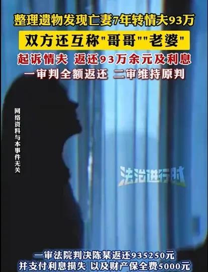 浙江宁波,男子的妻子因病离世,他悲痛万分,难以走出悲痛,直到他整理妻子的遗物,他发现妻子竟然在离世前一个月,还给情人转账,7年间给情人转了93万余元,他瞬间释然了,他不再悲痛,转而非常气愤,他没想到,妻子竟然给他带了那么久的绿帽子,于是他和女儿,还有岳父一起起诉,要求妻子情人返还这笔钱以及利息。 8月3日法治进行时报道,陈先生又一夜辗转难眠,妻子因病离世了,妻子解脱病痛了,却留下深爱她的陈先生,陈先生一想起和妻子的点点滴滴,他就痛苦得整宿都感到心痛。 又一夜过去,天亮了,陈先生精神恍惚,他再也无心躺在床上,就坐了起来,他要整理一下妻子的遗物,看看什么该丢弃,什么该留个念想。 他将妻子生前喜爱的衣服一件一件叠好,这些可能要烧给妻子,他又将妻子心爱的金银首饰,一件一件放好,这些东西是不能丢的,这些他也要留着做念想。 除此之外,他还要整理一下妻子的一些钱财,毕竟妻子生前是个女强人,在她手里经过的钱可不少,张先生要理清楚妻子的的金钱来往,这样他的晚年才有保障。 他一边整理妻子的遗物,一边想起妻子的点点滴滴,这些都是妻子和他辛苦打拼而来的,这些都充满了他们夫妻俩的回忆。 他一边伤心,眼含泪水,一边又不得不劝自己好好面对妻子的离去。 妻子的遗物整理得差不多了,接下来就要查看妻子的手机了,他要看看妻子到底有没有借钱出去,又或者她有没有借别人的钱。 结果这一看,他发现了妻子的一个大秘密。 妻子竟然在离世之前的一个月,她还给一名男子转账,那时的妻子已经深受病痛折磨,她怎么还要给别人转钱呢。 这个人引起了张先生的注意,于是张先生便查看他们的金钱来往,发现妻子在7年期间,竟然给这个男子转账了93万余元。 他们的关系不正常,张先生继续查下去,结果发现妻子喊这名男子叫哥哥,这名男子喊张先生的妻子叫老婆 。 其中有一段对话,张先生的妻子跟这男子说:“你是不是嫌弃我了?”男子则跟张先生的妻子说:“永远爱你老婆!” 看到这段对话,张先生一切都明白了,他的妻子背叛他了,而且已经背叛了7年,这7年间他竟然毫不知情,妻子还给她的情人转了93万余元,甚至在临死前的一个月还在转账。 张先生看到这些记录,他才意识到自己的深情,多么像一个笑话,他脸上露出了一个苦笑,瞬间丧妻之痛没了,心里只有不值。 他和妻子风风雨雨走过了那么多年,甚至妻子生病期间,也是他一直在床边伺候着她,对她无微不至,可妻子浑身疼痛,依然没有忘记自己的情人,在临死前一个月还转钱。 此时张先生内心只有愤怒,他只想着,妻子对他的情分早就没了,既然妻子早就对他没有半点感情,他又何苦为难自己。 他从此不再把自己困在丧妻之痛中,他也不甘心,他和妻子辛辛苦苦攒来的93万余元,就这样被妻子的情人拿走,于是他把这件事告诉了女儿,也告诉了岳父。 他们都决定要把这一笔钱拿回来,可是张先生妻子的情人,却表示这些钱都是生意上的来往。 张先生不信,起诉了妻子的情人,那么他的诉求是否会获得支持? 首先,张先生的妻子在世之前,和情人保持不正当的关系,他们的行为是有违公序良俗的。 《民法典》第8条规定:民事主体从事民事活动,不得违反法律,不得违背公序良俗。 有违公序良俗的赠与,属于无效民事行为,那么张先生妻子赠予给情人的钱财,是可以撤销的。 其次,张先生妻子赠与给情人的钱财,属于他和张先生之间的夫妻共同财产,张先生有权要回。 《民法典》第1062条规定:夫妻在婚姻关系存续期间所得的下列财产,为夫妻的共同财产,归夫妻共同所有,夫妻对共同财产,有平等的处理权。 对于夫妻共同财产,夫妻有平等的处理权,一方不得擅自赠与或者处理,张先生要回了这93万余元。 除此之外,张先生的妻子都四五十岁了,还做出背叛丈夫的事情,这是不利于家风建设的。 《民法典》第1043条规定:家庭应当树立优良家风,弘扬家庭美德,重视家庭文明建设。夫妻应当互相忠实,互相尊重,互相关爱;家庭成员间应当敬老爱幼,互相帮助,维护平等、和睦、文明的婚姻家庭关系。 如今张先生的妻子不在了,张先生知道妻子所做的事情,他也不会再思念妻子。