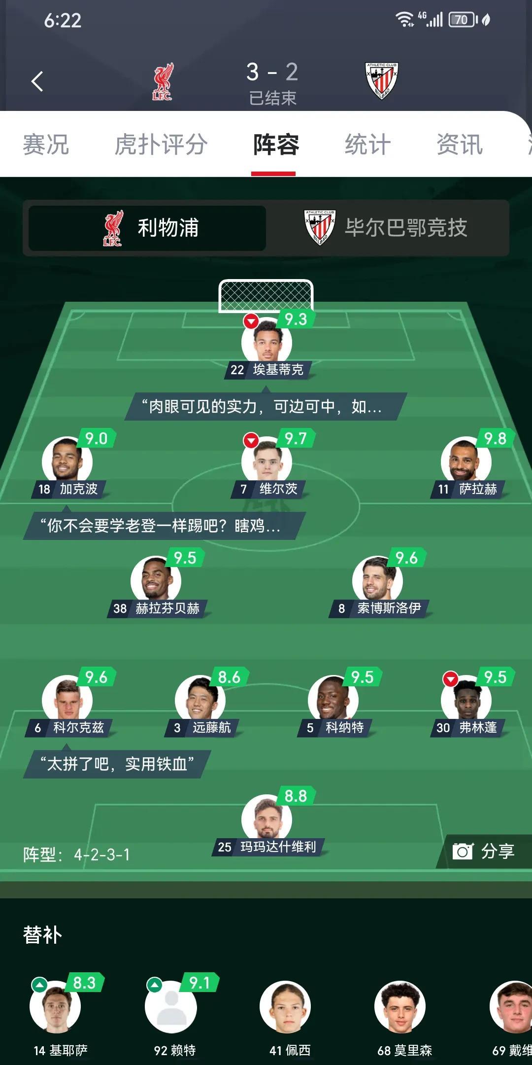 真是活久见,友谊赛还可以这么踢?看见两个比分还以为醒太早眼花了。居然还出现两个封面图。一会4-1,一会3-2,到底比赛是几比几?[捂脸] 打开一看原来是用了两套不同的阵容踢了两场比赛。 昨天看直播表我还以为他们出现失误了,怎么可能两支队伍踢两次比赛呢?原来是两个利物浦和两个毕八踢了两场比赛啊。 看了比赛维尔茨和凯尔凯兹真的高级货啊,索博也是真的强。斯洛特的传控踢得比瓜瓜还流畅迅速。阵容也这么富裕,新赛季太让人期待这支利物浦了。