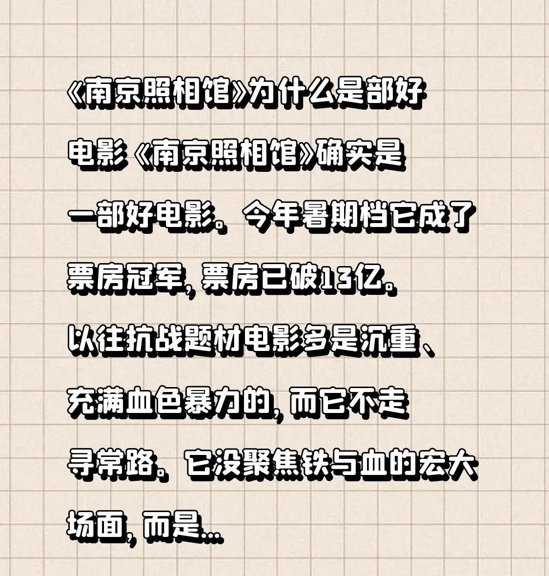 《南京照相馆》为什么是部好电影 《南京照相馆》为何是一部佳作呢?《南京照相馆》实实在在是一部很棒的电影。在今年的暑期档,它荣登票房冠军的宝座,票房已然突破13亿。 在抗战胜利80周年的当下,这部电影完整且尊重史实。这些小人物的怯懦、悔悟和温情,比起惊天动地的厮杀更令人难以忘怀,自点映起就收获了良好的口碑。 #南京照相馆# #南京电影放映# #南京老照相馆# #怀旧照相馆# #东方照相馆#